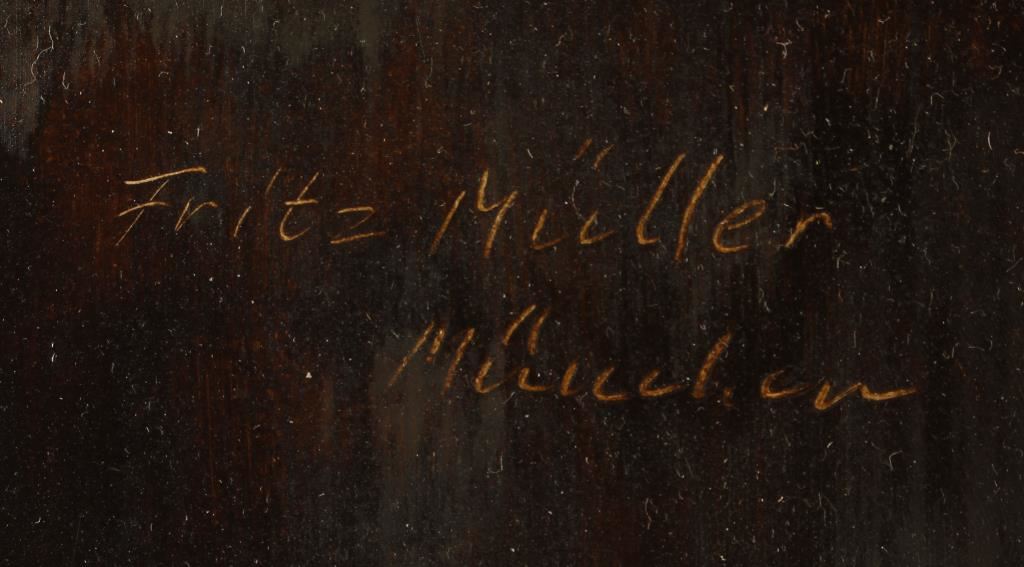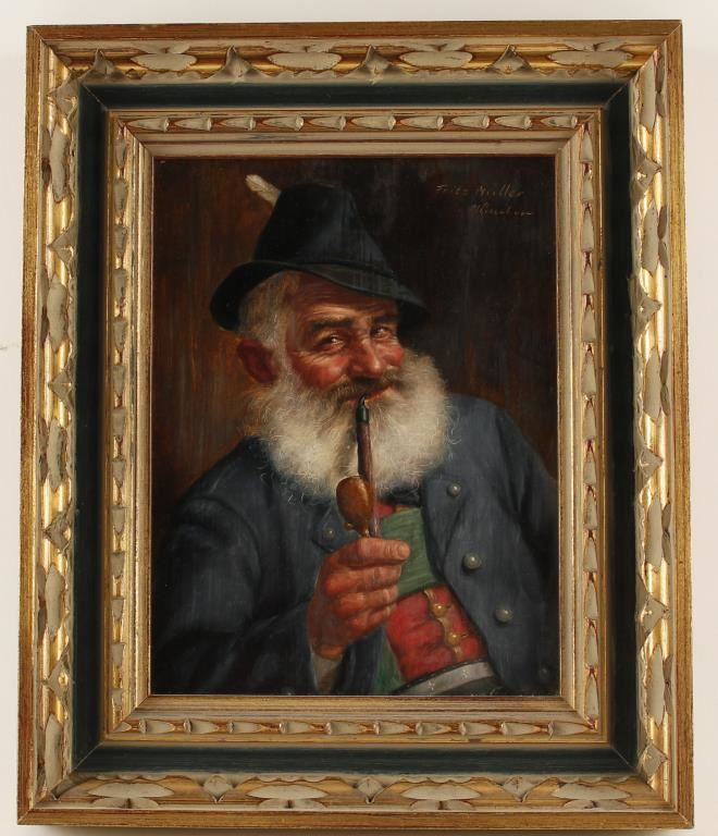 By noted German artist Fritz Muller depicting a German gentleman smoking a meerschaum pipe. In blue and gold frame 6 1/2x 8 1/2. From the estate of John Knoblauch noted Western art collector.