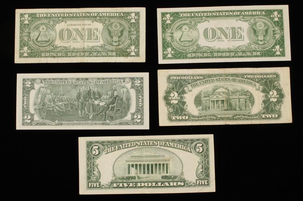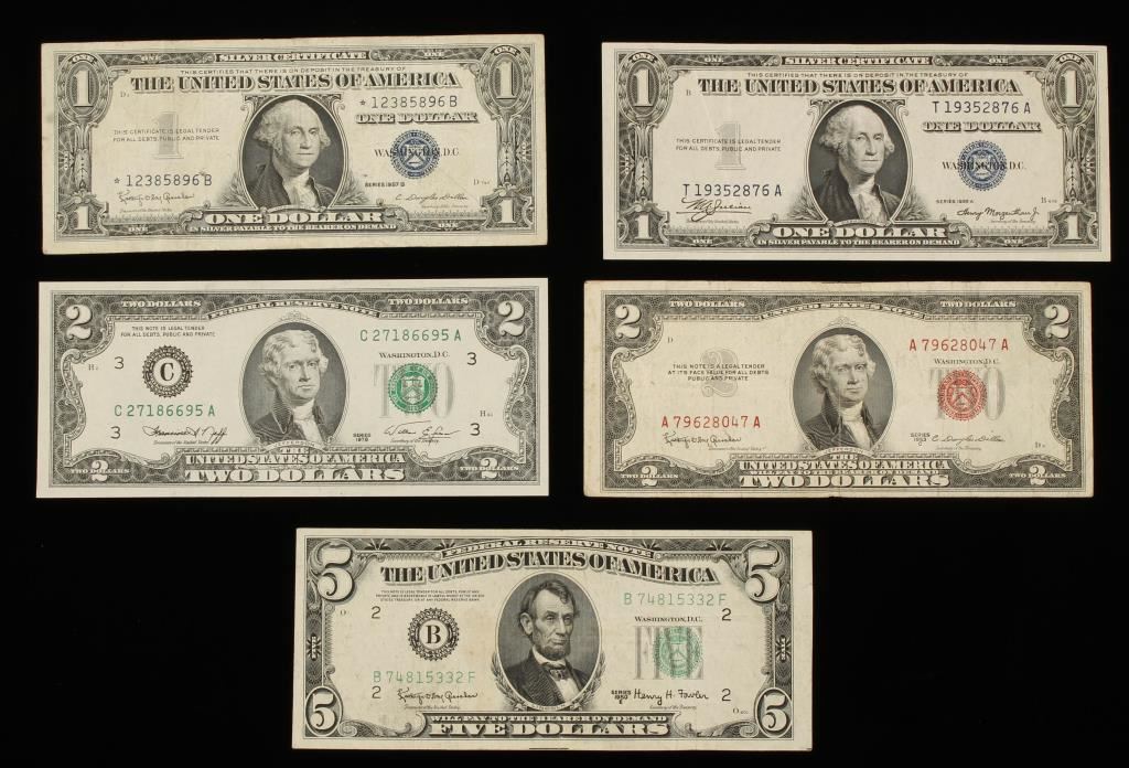 Including: $1 Silver Certificate-Series 1935A, another $1 Silver Certificate 1957B, $2 bill Series 1953C, $2 bill 1976, and a $5 bill Series 1950E.