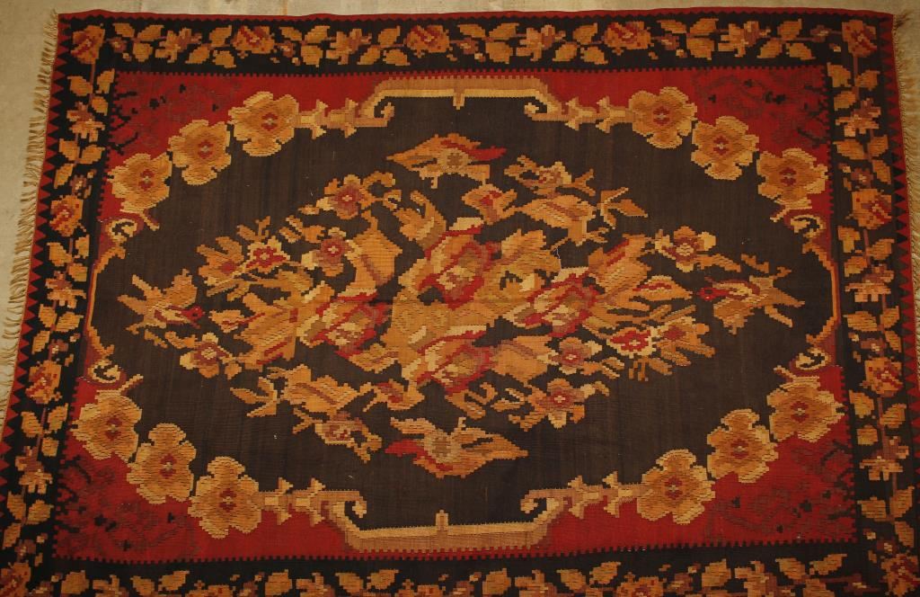 Cocoa brown, burgundy, and gold floral design. Measures 4'x5.9' overall good condition.