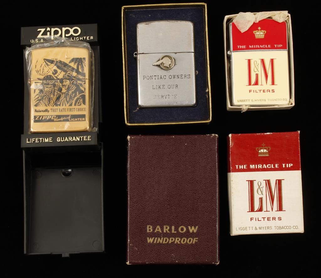 Pontiac Owner's Zippo engraved 'Miller Whitfield Inc, Toledo, OH" in box. Sold Brass Zippo with WWII Military motif and an L&M Tobacco Co. Zippo in original box.