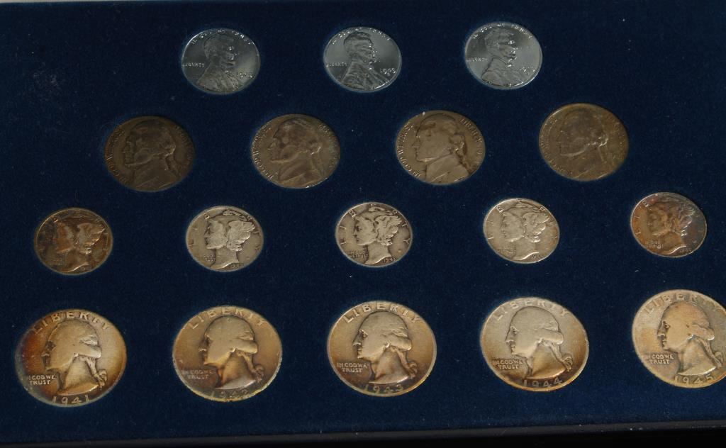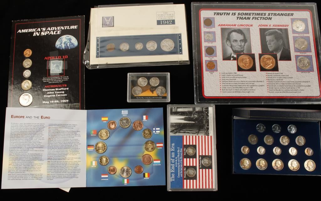 Including 1945 WWII last year of Mercury dimes, Philadelphia Mint, Denver Mint and San Francisco Mint. Westward Series nickels, United States of Europe First Coins Set, WWII 1942 Mint Set, WWII Coinage Collection, America's Adventure in Space Apollo 10 Denver Mint 1969 Set and The Truth is Sometimes Stranger than Fiction-Abraham Lincoln & John F Kennedy Set.