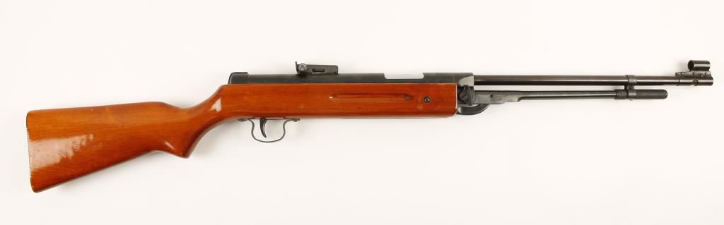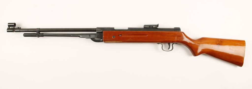 Single shot air rifle with a 17-3/4" barrel, adjustable rear sight and wood stock. Condition is good to very good.