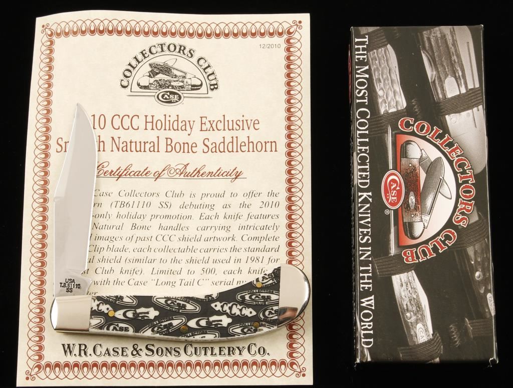 One of 500. Made in 2010. Stamped "T.B. 61110 SS" on the ricasso and "213 C XX" on a bolster. Handles are natural bone with laser etched past Case Collectors Club shields randomly spread over the surface. Blade is 2-11/16" long. Includes factory Collectors Club box with tissue paper, Certificate of Authenticity, document, promotional flyer and original receipt. Condition is excellent.