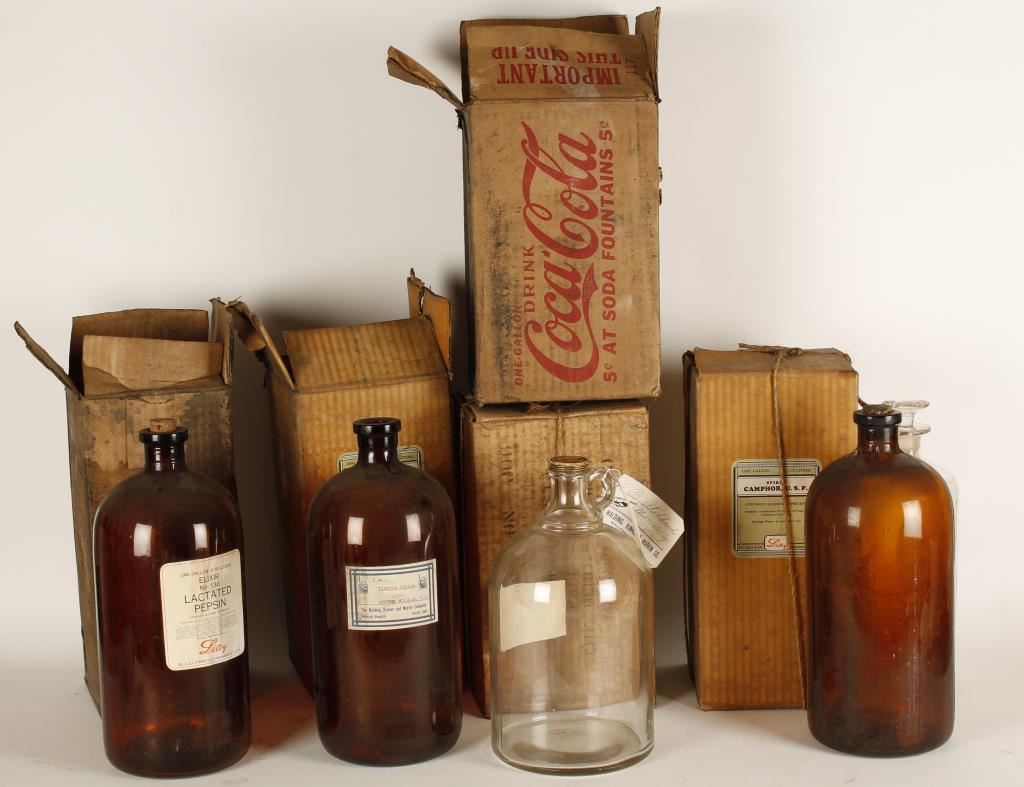 A collection of clear and brown glass bottles with glass, cork and metal tops. 12"-14" high. One label reads "Walding, Kinnen & Marvin Co. Wholesale Druggists, Toldedo, Ohio." One label reads "Methyl Salicylate, Oil Wintergreen, Synthetic". Overall fair condition. Also included is an original cardboard Coca Cola box, shows age.