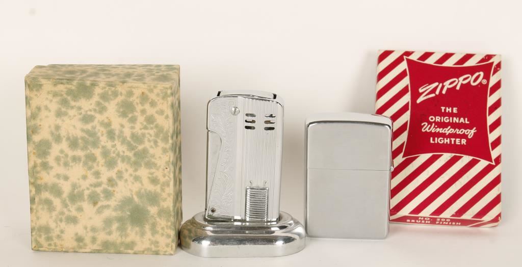 1 is Zippo, a plain stainless Zippo in original box, 1 Corona brand tabletop lighter.