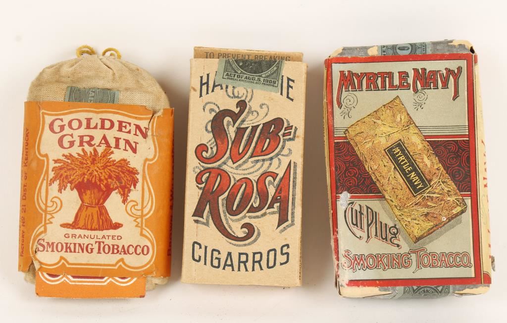 1 Myrtle Navy Smoking Tobacco, 1 Subrosa Cigarillos, and 1 Golden Grain Granulated Smoking Tobacco Pouch.