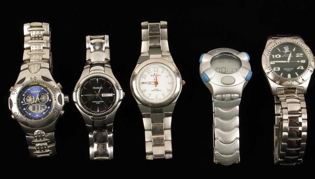 Including a Field & Stream water resistant 30M 100' stainless steel watch in box, Sharp stainless steel wristwatch with blue face, Swatch Beat aluminum Ultra Light, Armitron water resistant stainless steel watch, and Paul Jarden water resistant stainless steel that is missing one rubber piece.