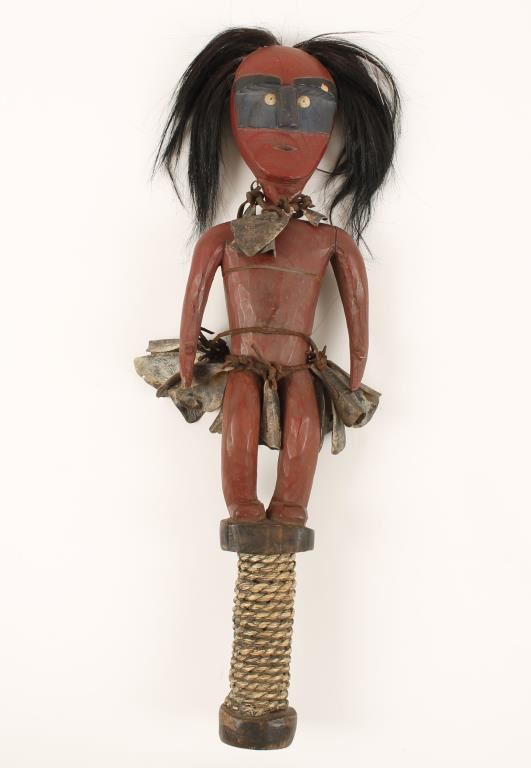 Figural rattle of an indian warrior, complete with hair rattling necklace and rattling ceremonial skirt. Braided reed wrapped handle. Condition is very good.