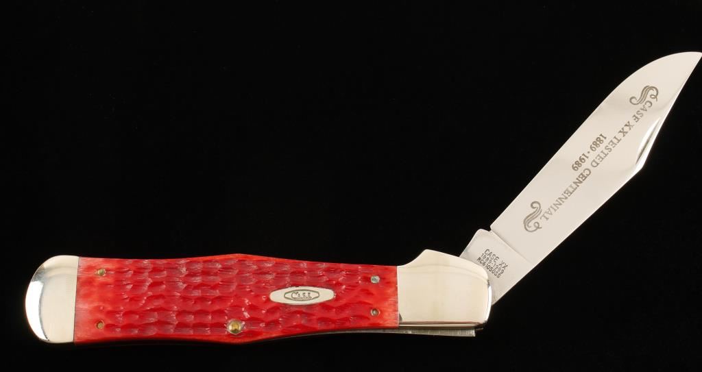 Made in 1989. Stamped "RC61050 SS". Handles are red jigged bone or Delrin. Blade is 4-1/8" long and etched with "Case XX Tested Centennial 1889-1989". Condition is excellent.