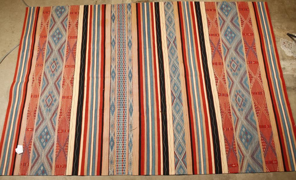 Geometric pattern and stripes in tan, black, cream, blue and red. Measures 6'x8.9'.
