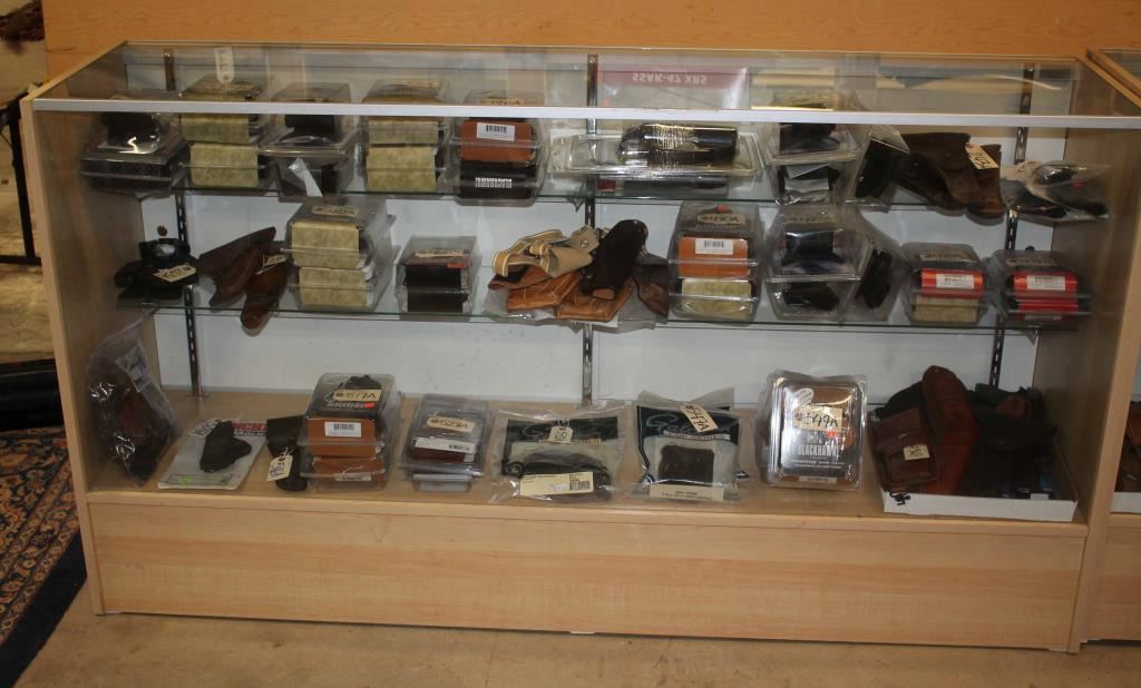 Place this beautiful glass showcase on your showroom floor to highlight your premium items. This glass display case features a glass top, glass front, two full length adjustable glass shelves and comes in a Maple laminate melamine finish. It has two sliding white doors. Lights and locks are not included. Measures 70" x 38" x 18". Top glass shows scratches. Condition is good.