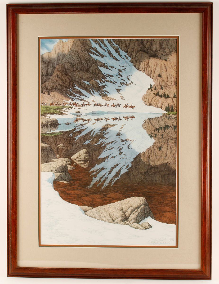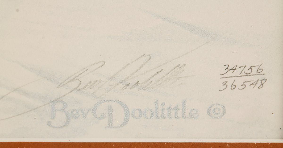 By noted western artist Bev Doolittle entitled "Season of the Eagle". Limited edition number 34756 of 36548. Hand signed in pencil on lower right hand corner. Triple matted and framed. Image size is 17-1/2" by 27". Includes Greenwich Workshop Certificate.