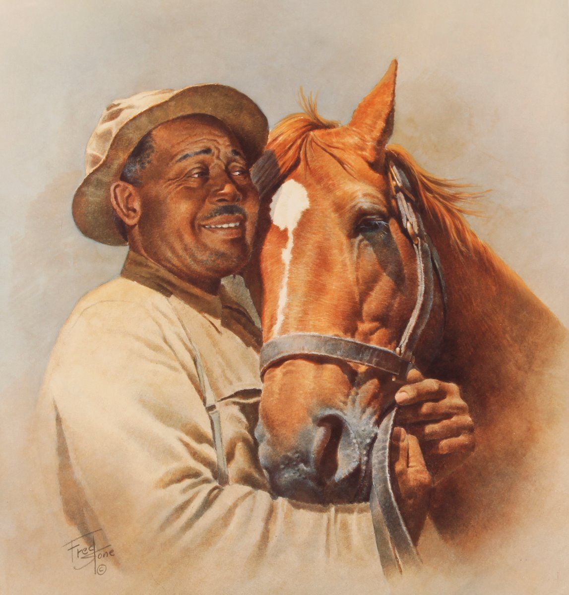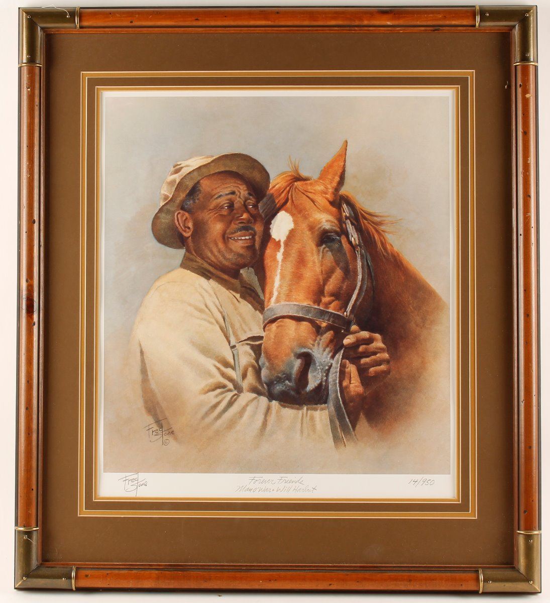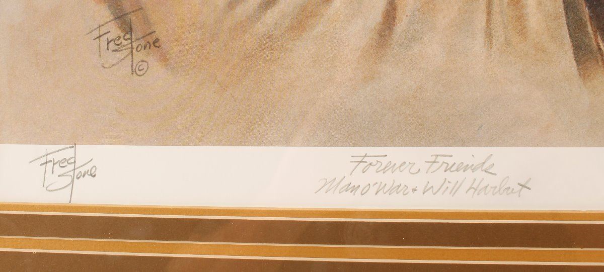 By noted artist Fred Stone. Entitled "Forever Friends Man o' War and Will Harbut". Number 14 of 950. Hand signed in pencil at lower left hand corner. Double matted and framed. Image size is 17" by 20". Includes a certificate of registration and authentication from Fred Stone on back.