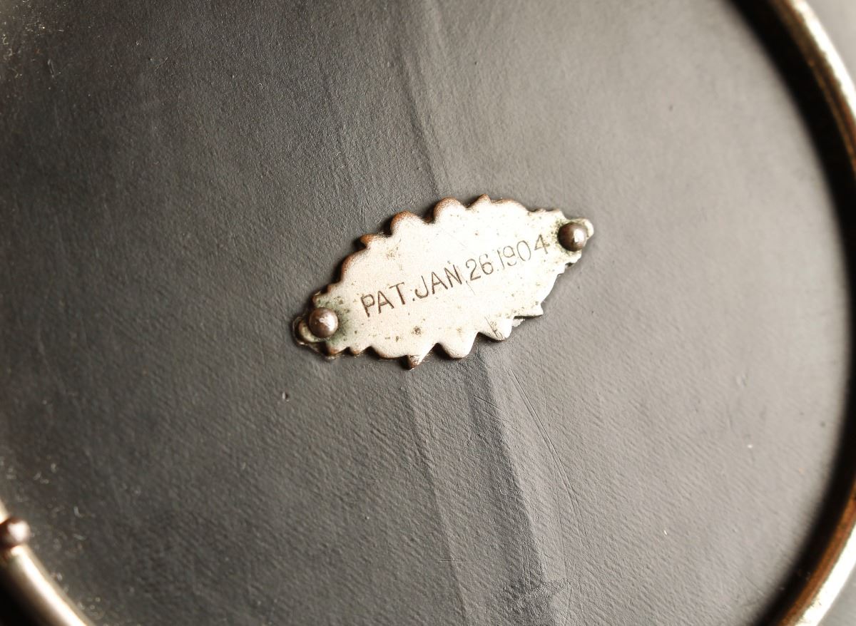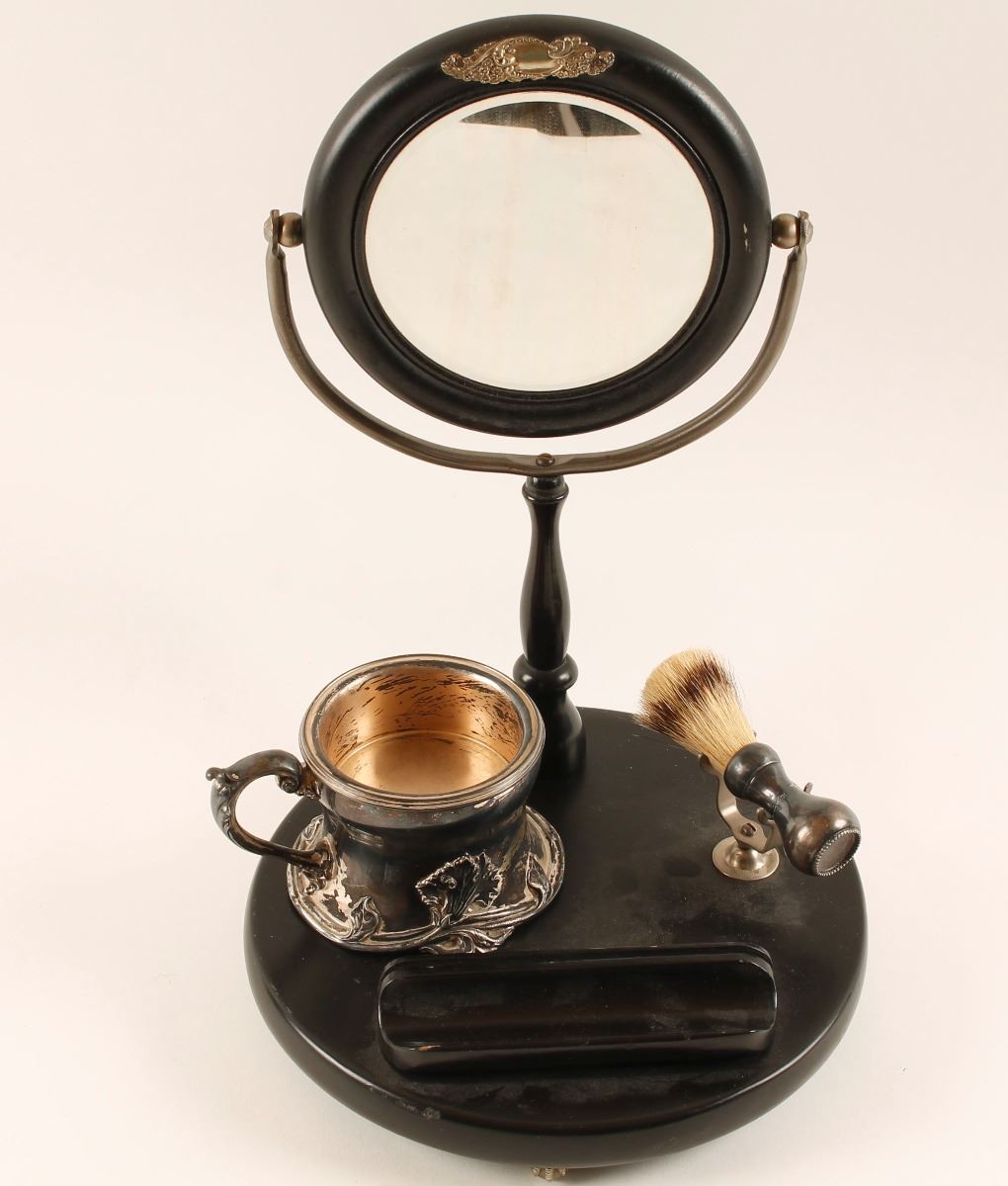 Black laquered wood construction with round beveled mirror, Reed & Baron plated sterling shaving mug with floral design, holder for shaving brush with silver plated as well, comb holder and base is stamped pat"d date January 28,1904. Excellent overall condition.