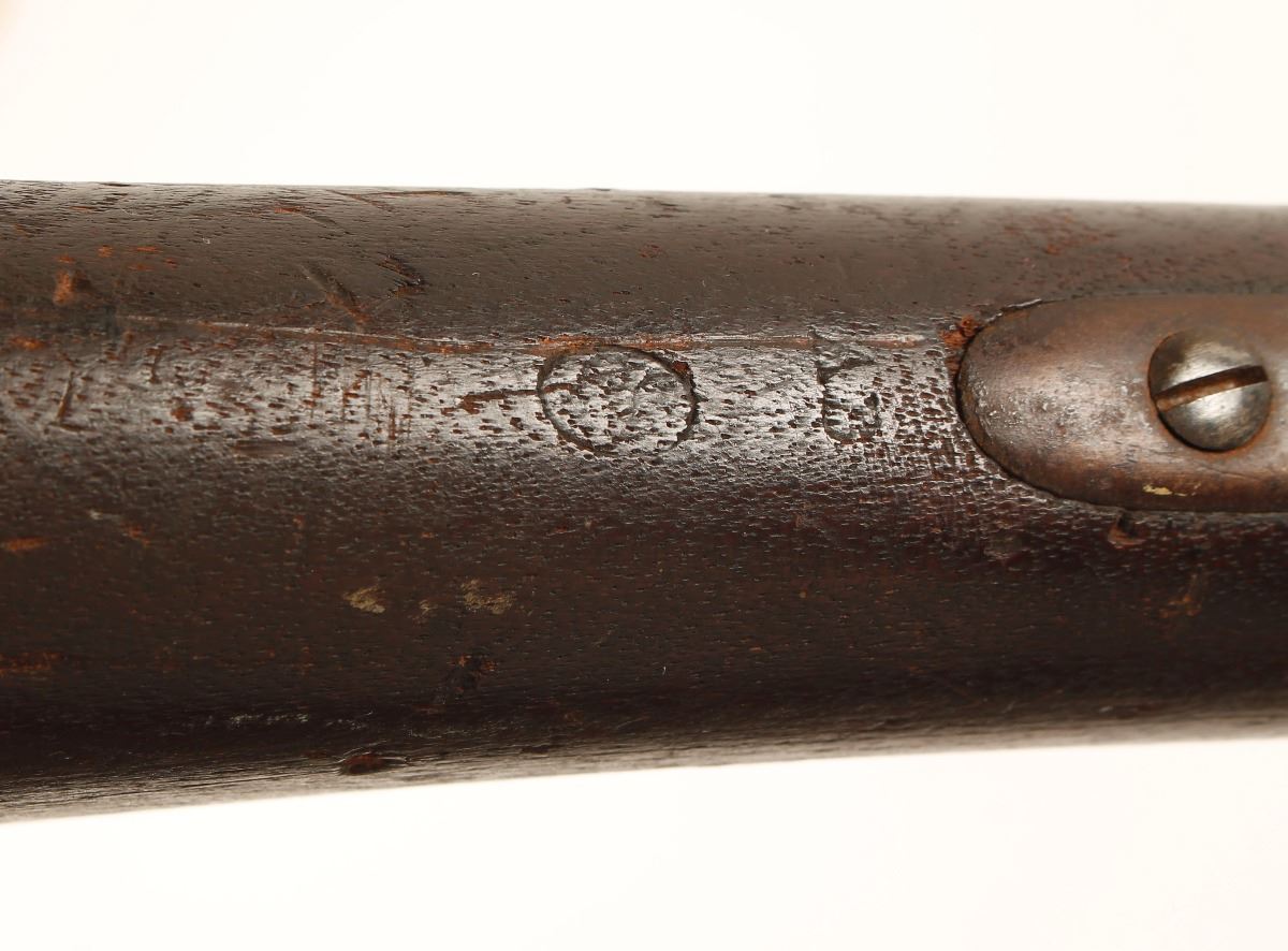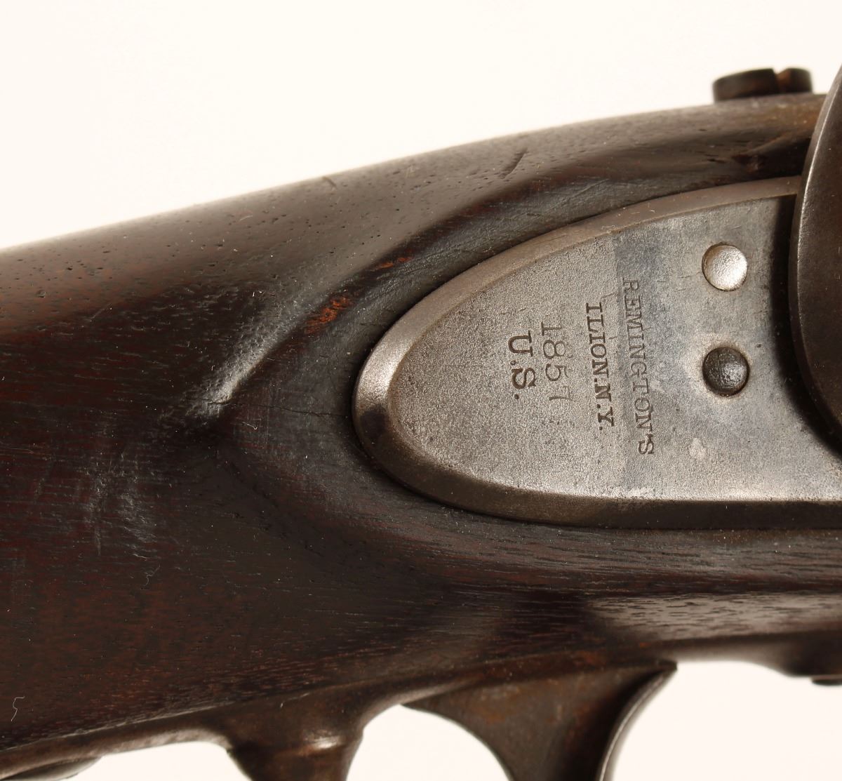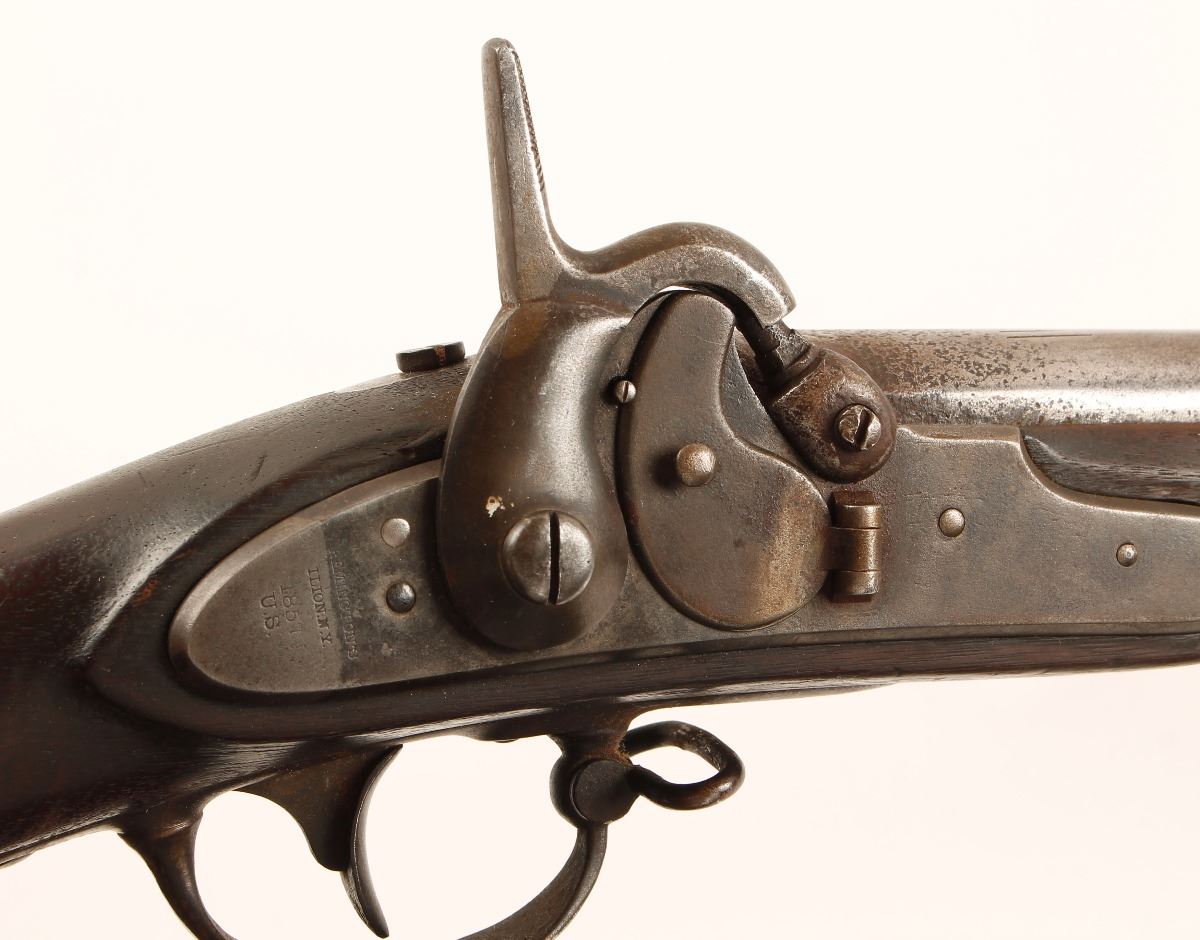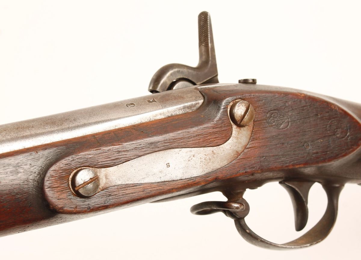 Blued percussion tape primer rifled musket conversion of a M1816 Type 2 or Type 3 musket with a 42-1/4" round barrel, steel forend, 2 barrel bands, wood stock with cartouches, a ramrod and a steel buttplate. Barrel has a speckled grey and brown patina with scratches and some pitting. Bore has evidence of pitting but retains good rifling. Barrel tang is stamped "1857', "D E 4". Barrel has "P" in an oval and an eagles head stamped on it. Lock plate is stamped "Remington's Ilion N.Y. 1857 U.S." Trigger guard has "SP" stamped ahead of the bow and "B" behind it on the tang. The buttplate has "US" stamped on it. Lockplate has a silver/blued patina with some pin-prick pitting. Trigger guard has a mottled patina with some pin-prick pitting. Buttplate has surface rust and scratches and dings. The sideplate is in-the-white with surface rust and an "S" stamped on it. Ramrod is mottled silver and blued finish. Wood stock has dings, dents, scratches and bruises but no overt cracks or large chips. There are 2 cartouches on the left of the stock and 2 behind the trigger guard tang. Action works well but the advancing pawl for the Maynard primer tape is missing. Condition as an antique is very good to excellent. *Antique Firearm*