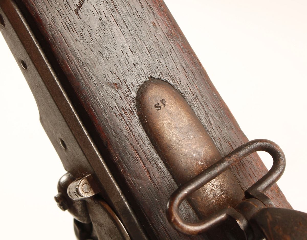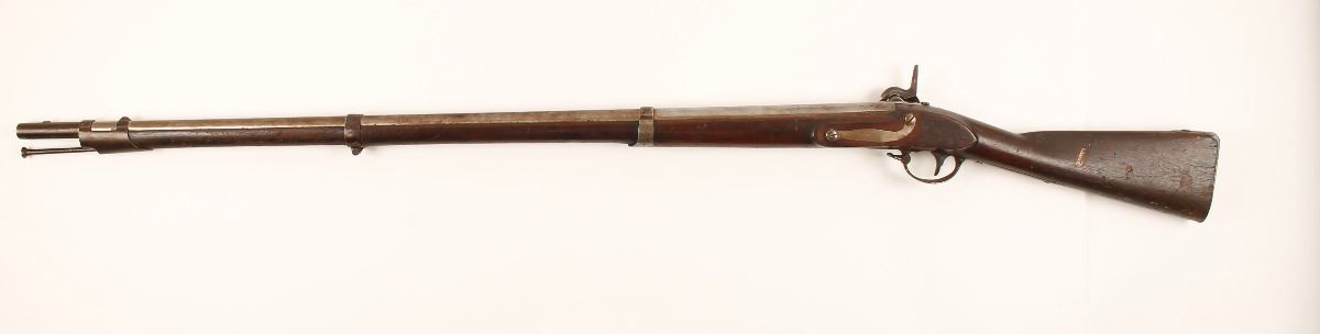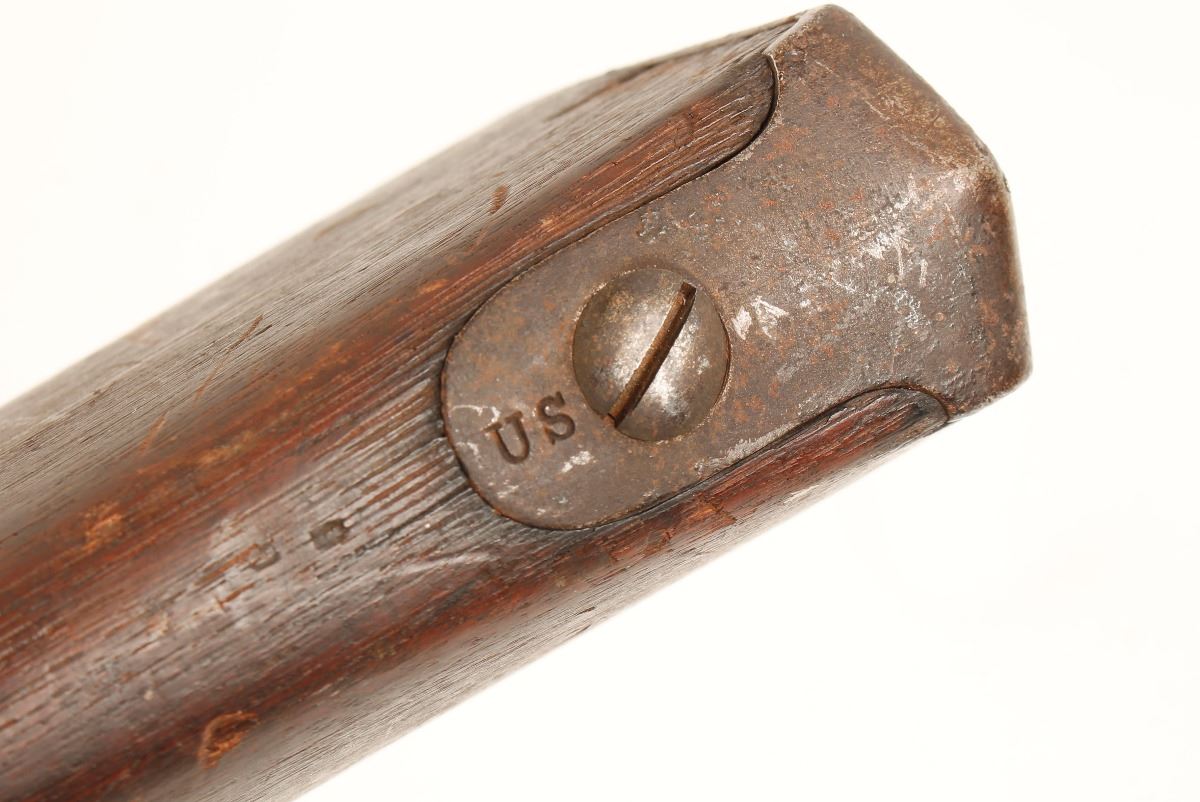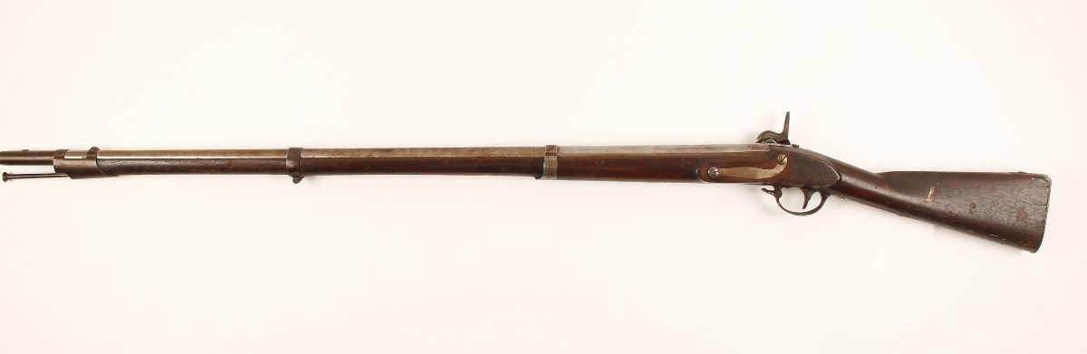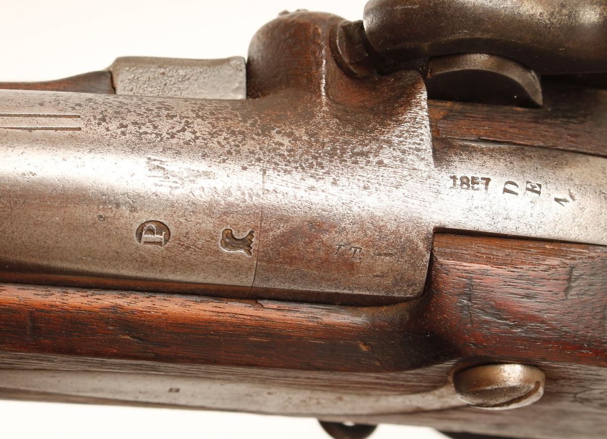 Blued percussion tape primer rifled musket conversion of a M1816 Type 2 or Type 3 musket with a 42-1/4" round barrel, steel forend, 2 barrel bands, wood stock with cartouches, a ramrod and a steel buttplate. Barrel has a speckled grey and brown patina with scratches and some pitting. Bore has evidence of pitting but retains good rifling. Barrel tang is stamped "1857', "D E 4". Barrel has "P" in an oval and an eagles head stamped on it. Lock plate is stamped "Remington's Ilion N.Y. 1857 U.S." Trigger guard has "SP" stamped ahead of the bow and "B" behind it on the tang. The buttplate has "US" stamped on it. Lockplate has a silver/blued patina with some pin-prick pitting. Trigger guard has a mottled patina with some pin-prick pitting. Buttplate has surface rust and scratches and dings. The sideplate is in-the-white with surface rust and an "S" stamped on it. Ramrod is mottled silver and blued finish. Wood stock has dings, dents, scratches and bruises but no overt cracks or large chips. There are 2 cartouches on the left of the stock and 2 behind the trigger guard tang. Action works well but the advancing pawl for the Maynard primer tape is missing. Condition as an antique is very good to excellent. *Antique Firearm*