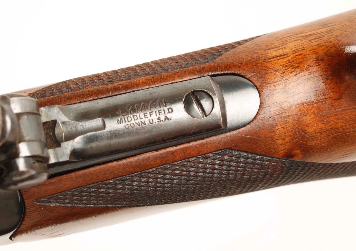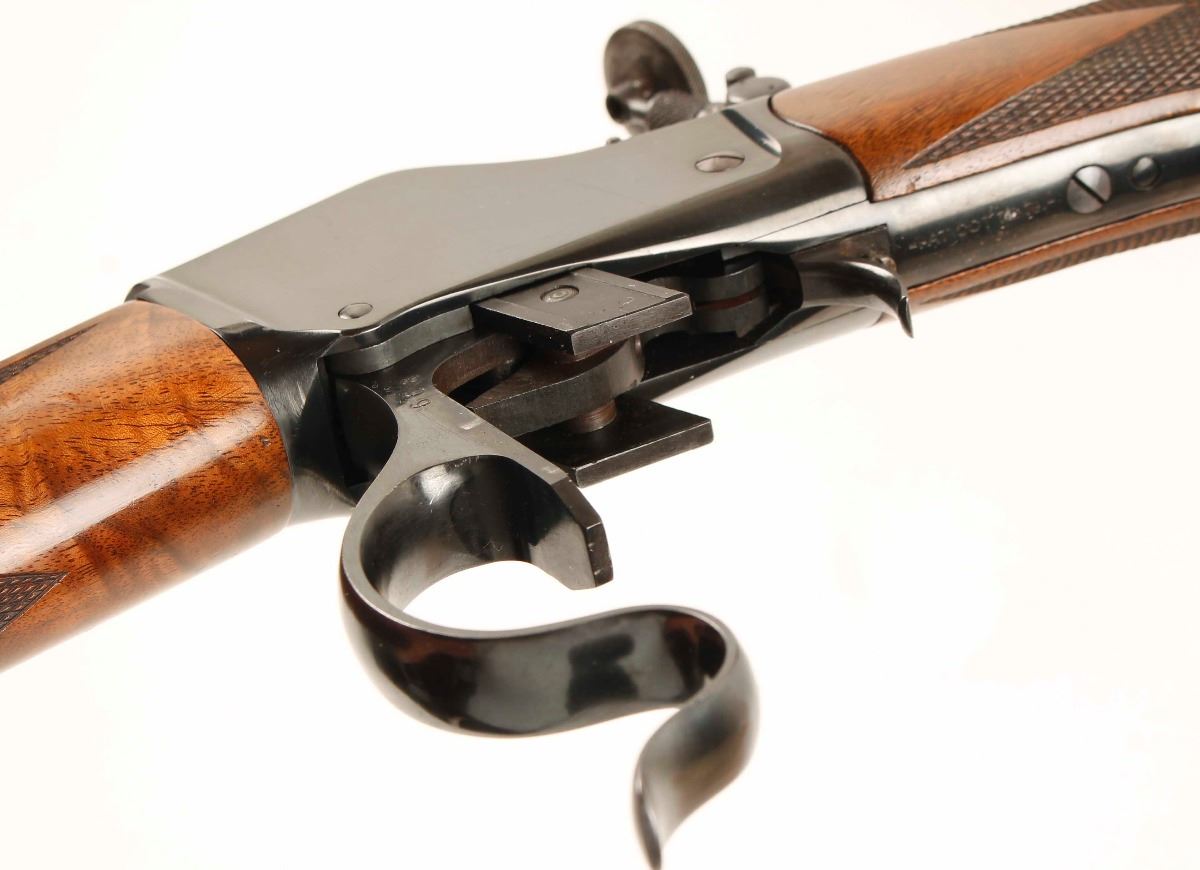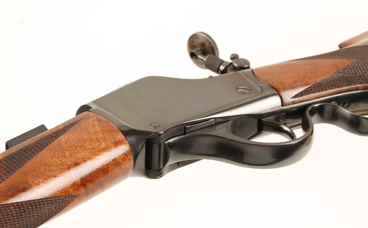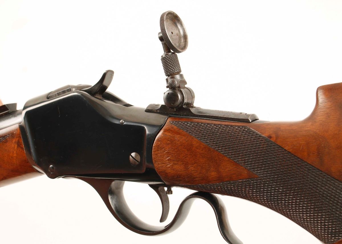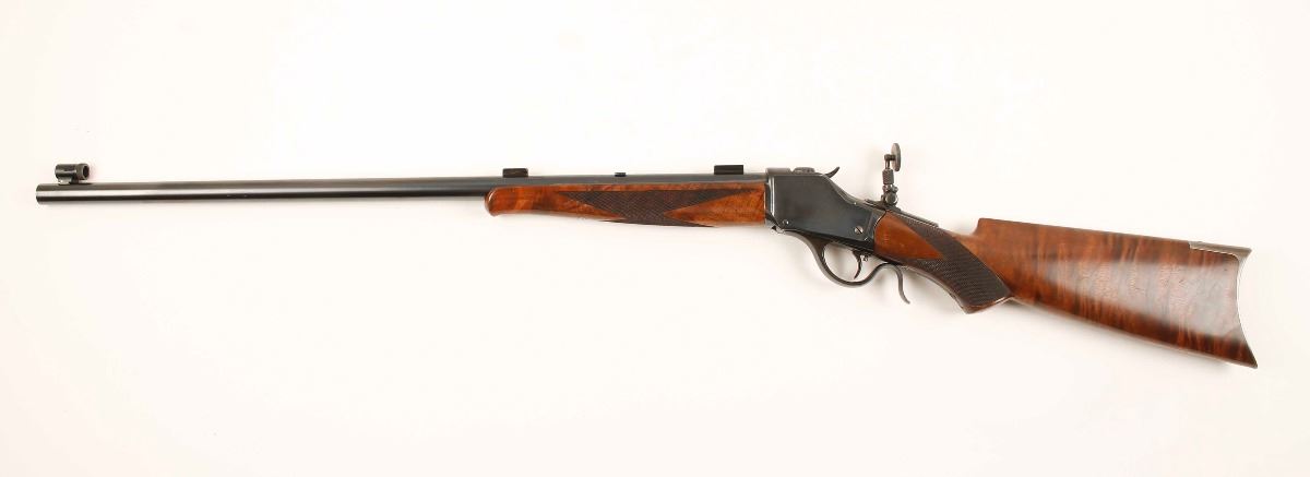 Made in 1890. Blued single-shot drop-block High Wall with a 25-7/8" heavy barrel, a Lyman tang sight, globe front sight, scope blocks (at 7-1/4" between centers), adjustable single set trigger, deluxe checkered furniture with Schnabel forend and pistol grip buttstock and a steel crescent butt plate. Metal finish shows little high point and edge wear with a scuff on the lever and tiny scratches beside the tang sight and on the flat sides. Barrel has what may be a rust blue finish. Buttplate has faded to a mottled grey finish. Wood has a number of scratches, rubs, dents and dings but is in generally very good condition. Bore is bright and shiny with good rifling. Action seems to work well. Condition is excellent as an antique. *Antique Firearm*