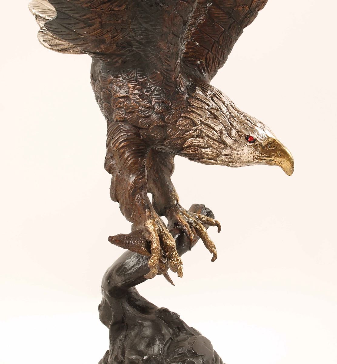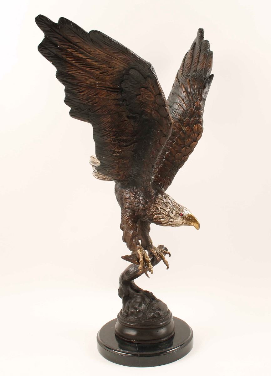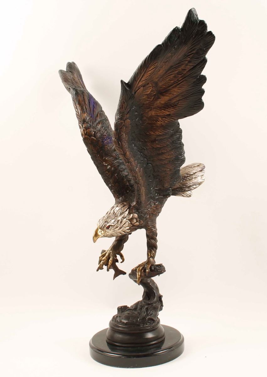 Beautiful hand painted eagle bonze on round marble base. Depicts an eagle with spread wings and a fish in it's grasp while posted on a branch. Nicely colored with gold, silver, red and bronze. Features a carved signature on back with gold appearance. This bronze statue by Jules Moigniez is handmade and cast in the traditional Lost Wax Casting Process. Measures 25" x 15". Condition is excellent.