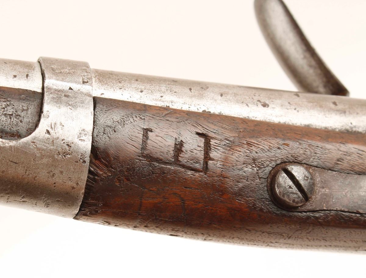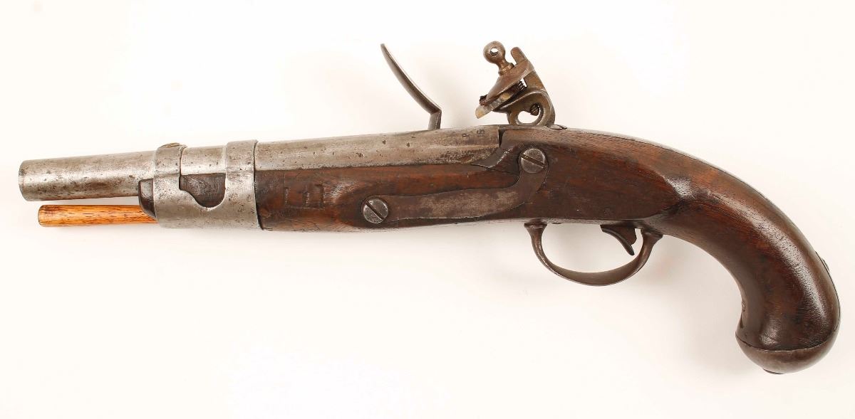 Early production U.S. Military model 1816 flintlock pistol chambered in .54 caliber, circa 1817 - 1820. These pistols were used in the Seminole Wars, Mexican War and converted to percussion for use in the Civil War. Features a 9 1/16" barrel proofed "P" & "U.S.", lock marked "S. North/U(eagle)S/Midln Con.", brass blade sight on barrel band, brass flashpan, original flintlock configuration, replaced ramrod with slotted iron ferrule to accommodate patches, wiper & ball screw and a one piece hardwood plain pistol grip stock. Pistol shows a even mostly dark patina with legible markings. Wood stock has a faint remnant of original cartouche, dings, cracks and small losses. Bore is clear and action is in working order. A great piece of early U.S. Militaria. Condition is very good as antique. ***Antique Firearm***
