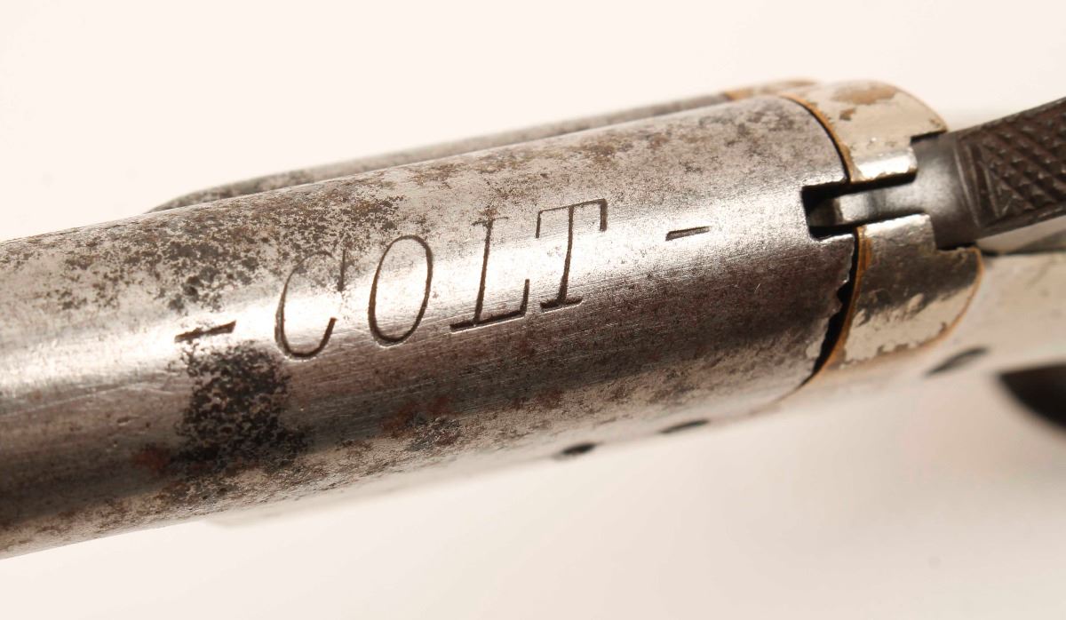 Early Colt Thuer standard model single shot spur trigger derringer chambered in .41 Rimfire. Features a 2.5" pivoting barrel, silver front sight, nickel plated frame, blued spur trigger & sloping hammer and varnished walnut bird's head grips. Barrel show moderate pitting with little traces of original finish, nickel plating on frame is 85% intact and all marking are legible. Wood grips are near excellent, bore shows rifling and action is strong. Condition is very good+ as antique. ***Antique Firearm***