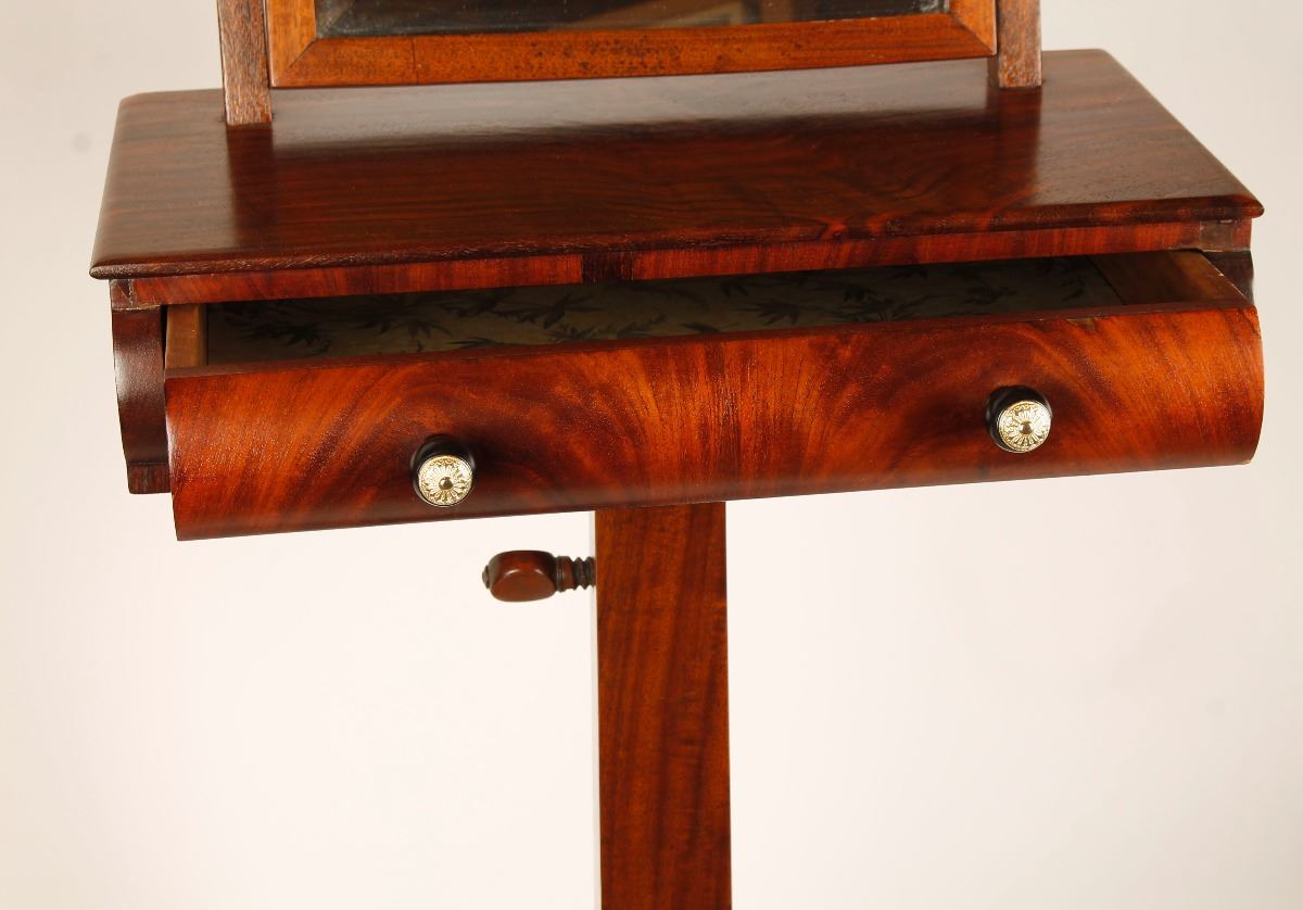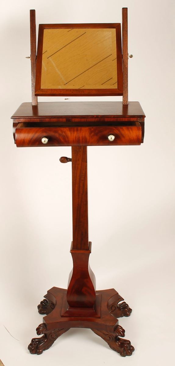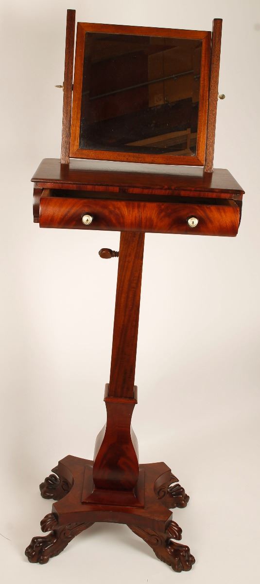 56" with extendable base X19"WX11"D, with with 12X1 beveled edge mirror, with drawer, and carved tiger paw feet. Excellent overall condition. Circa 1880-1890's.