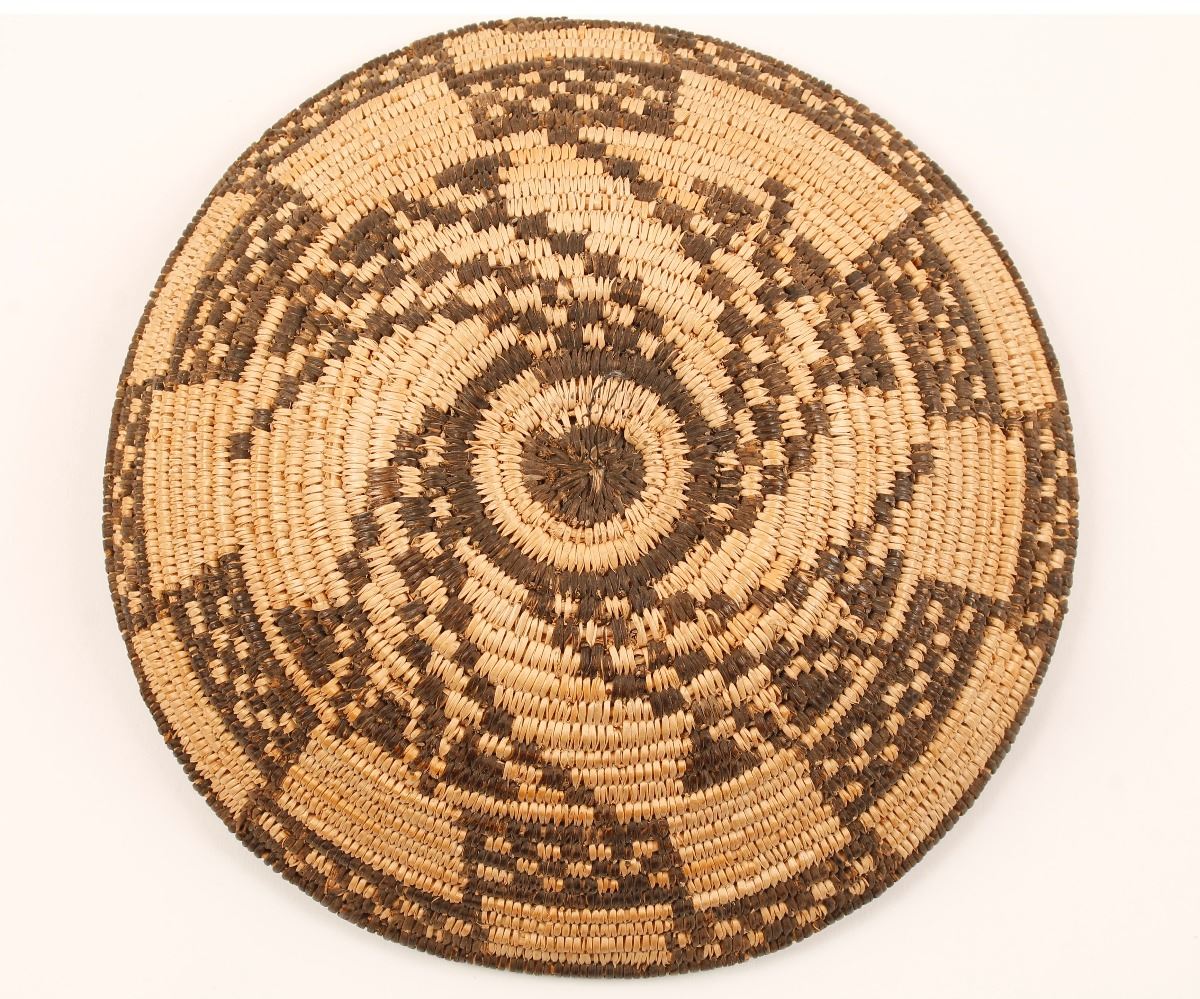 Early piece, nicely executed with geometric design. Circa 1890-1920. Included is a silver button hanger. A very attractive basket, measures 8.3" x 2.3". Condition is very good+.