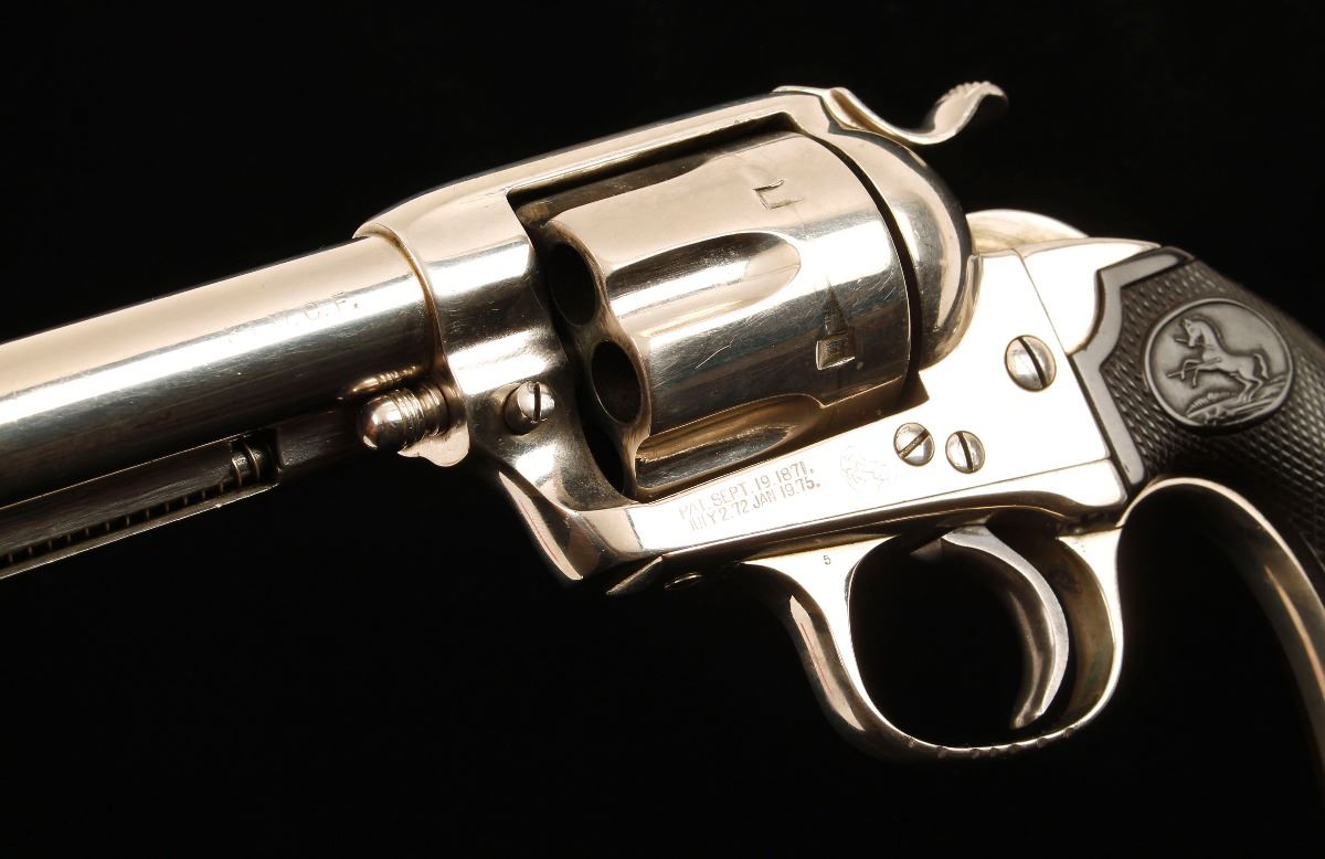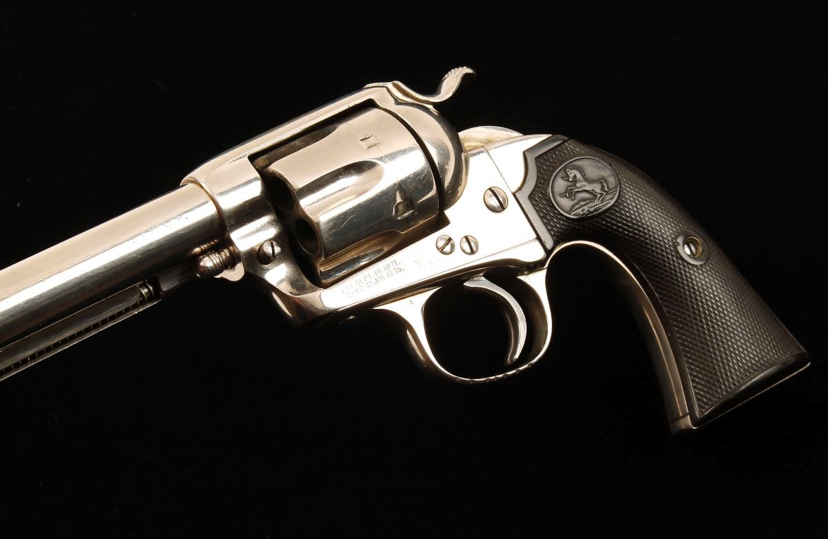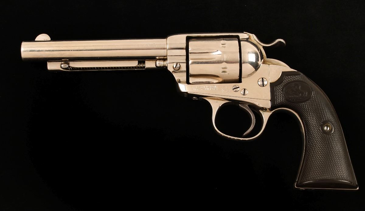 Refinished single action six shot revolver chambered in .38-40 and manufactured in 1904. Features an old renickeled finish(originally blued), 5.5" barrel, blade front sight, v-notch rear sight, bobbed ejector ring, nickel plated steel frame with push button cylinder pin release, nickeled fluted six shot cylinder, wide spur hammer and checkered hard rubber grips with rampant colt decor. All matching serial numbers on frame trigger guard and backstrap. Includes Colt factory letter witch confirms caliber, barrel length and original finish. Also states that this revolver was shipped to Lee, Glass, Andreesen Hardware Co. Omaha, Nebraska August 13th, 1904 in a four gun shipment. Shows good old nickeled refinish with seven notches in the trigger guard under the nickel. Patent marks, barrel address and Colt horse are sharp but "Bisley Model" is very weak. Grips are in good condition with the following inscriptions in the right grip, Lena Rohr Raton NM 1916, Marie Catalina Trinadad Co. 4-7-17, Katie Evans Dawson Al 2-3-18, Gladys Horn Roy NM. Left grip is inscribed with dates and initials, should be further researched. Bore is fair to good with solid action. Condition is very good as refinished. ***Modern Firearm***