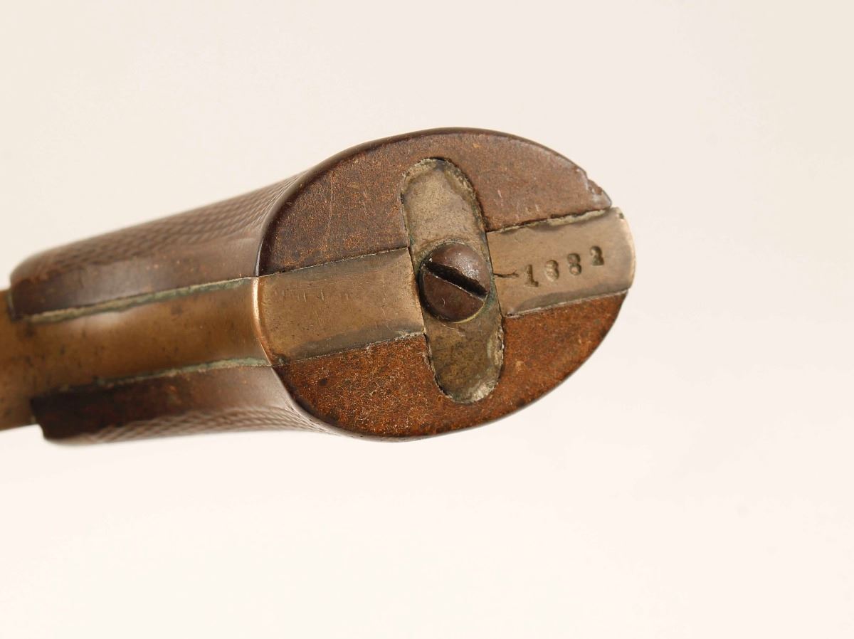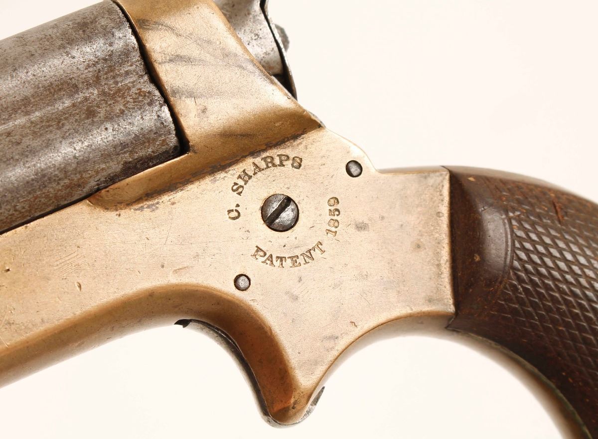 Four shot breech-loading pepperbox pistol chambered in .22 short, circa 1859 - 1874. Features four 3" barrels, front bead sight, v-notch rear sight, rotating firing pin on hammer, smooth spur trigger, brass frame, "C. Sharps Patent 1859" & C. Sharps & Co. Philada, PA." markings and nicely checkered one piece hardwood grips. Frame has a nicely aged brass patina with mostly crisp markings, barrel, trigger & hammer are now in the white with small amounts of pitting and dark areas. Checkered wood grips are in very good shape with smoothed diamonds, bores are very good and action needs a little work getting the trigger to return. A good honest Sharps. Condition is very good as antique. ***Antique Firearm***