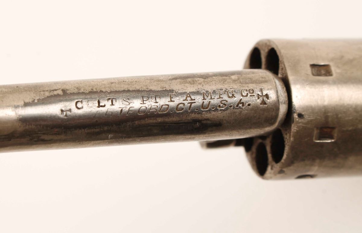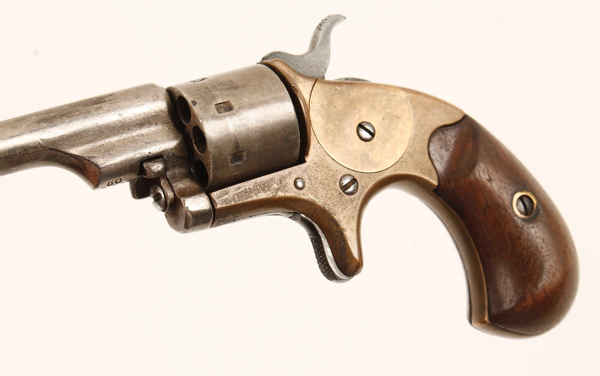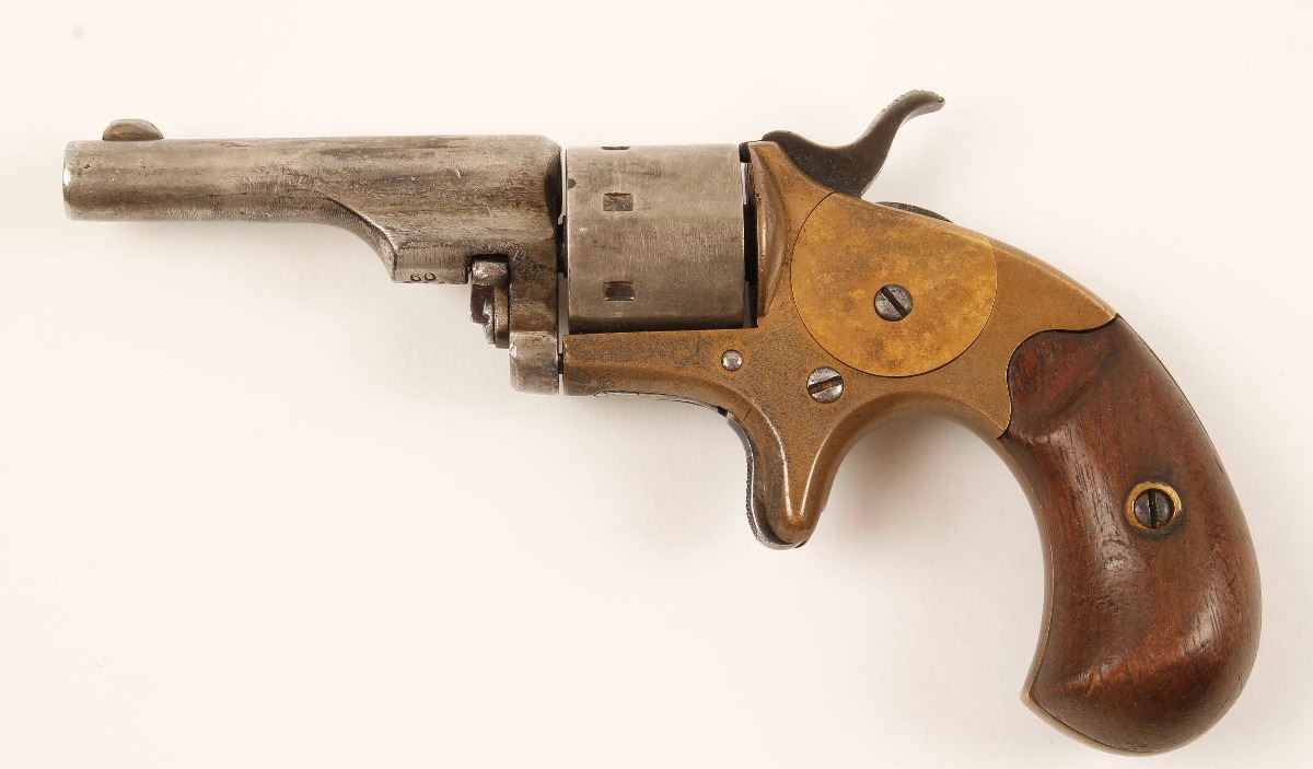 Antique Colt open top pocket model seven shot revolver chambered in .22 short/long, circa 1873. Features a 2 3/8" barrel, "Colt's Pt. F.A. Mfg. Co. Hartford Ct. U.S.A." barrel address, fixed sights, non-fluted cylinder, brass frame, matching serial numbers, blued checkered spur trigger & sloping hammer and two piece walnut grips. Markings are mostly crisp, barrel and cylinder are in the white with traces of previous blue finish, frame has an excellent aged brass patina and sideplate has a little less patina. Wood grips are excellent with no varnish remaining, bore is dark with some rifling and action works well. Condition is very good as antique. ***Antique Firearm****
