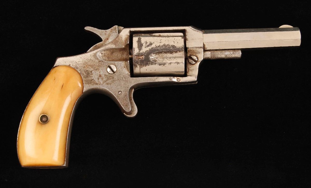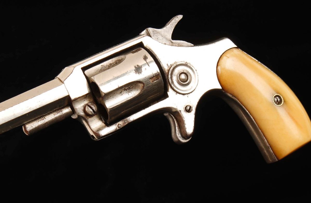 Nickel finished spur trigger small frame revolver chambered in .32 Rimfire. Features a 2.75" octagonal barrel, fixed sights, five shot fluted cylinder, checkered hammer spur and nicely aged bone grips. Finish shows approximately 80% original nickel plating intact and dark areas where there is no plating. Grips are in very good condition, bore shows strong rifling and action is firm. Condition is very good+ as antique. ***Antique Firearm***