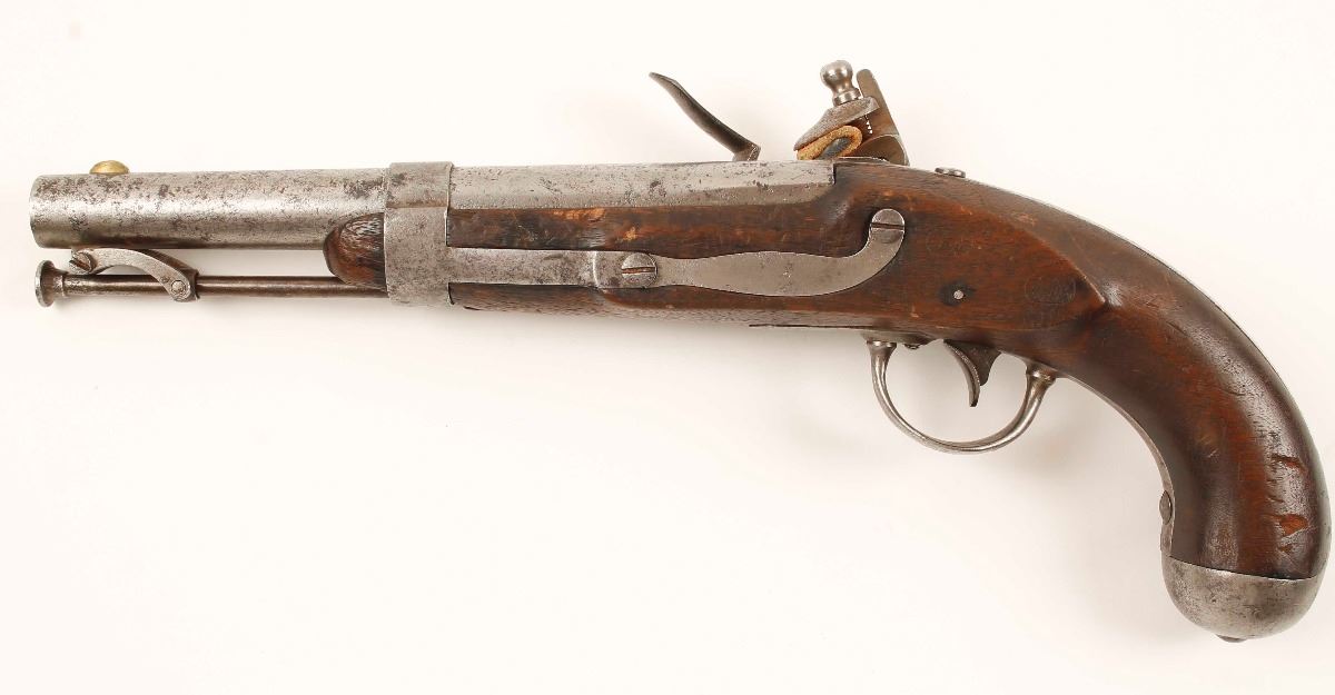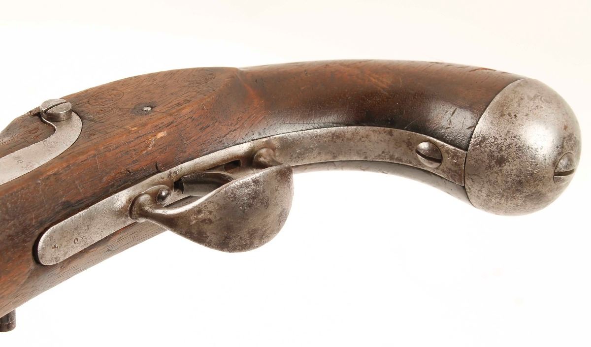 Original U.S. Military flintlock pistol chambered in .54 caliber, circa 1836 -1844. Features a 8.5" barrel proofed "U.S./JCS/P", brass front sight, barrel band strap that extends to the sideplate, swivel type steel ramrod with button head, iron mountings, lock marked (Eaglehead) "A. Waters / Milbury MS./1837", brass flash pan, original flintlock configuration, replaced hammer and one piece cartouched hard wood pistol grip stock with iron cap. Pistol shows scattered dark pitting with otherwise light patina. Wood stock has minor dings & losses, and is marked with "JA" and has "JA" & "HKC" cartouches. Other markings include an "A" & "O" on trigger guard and "O" on sideplate. A very nice representative of an original Model 1837 U.S. Military pistol. Condition is very good as antique. ***Antique Firearm***