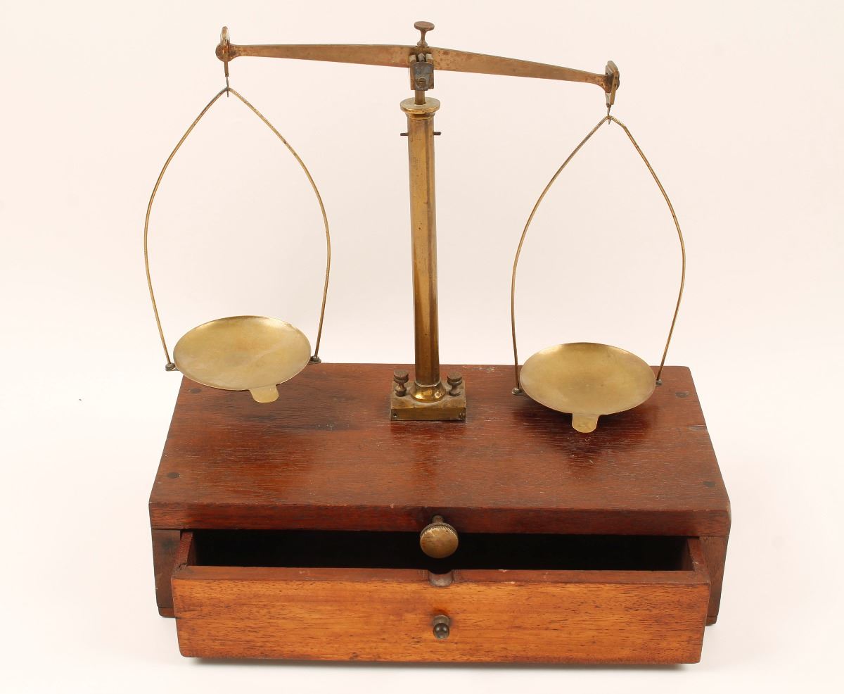 Portable miners scale comprised of brass and wood. Scale is self contained in it's wood base when disassembled, base measures 11" x 2.75" with a pull out drawer. Scale is nearly complete only missing the scale placard, a very nice example of an early scale miners would use during their conquests. Condition is very good.