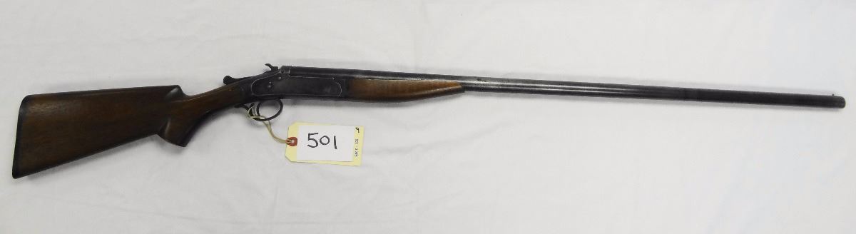 Lot 501 IVER Johnson 12GA 3/4" single barrel, 36" plain choke bored barrel, bluing rubbed wood, in good con