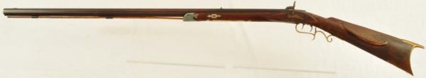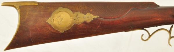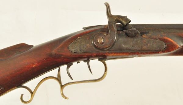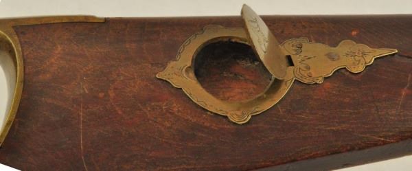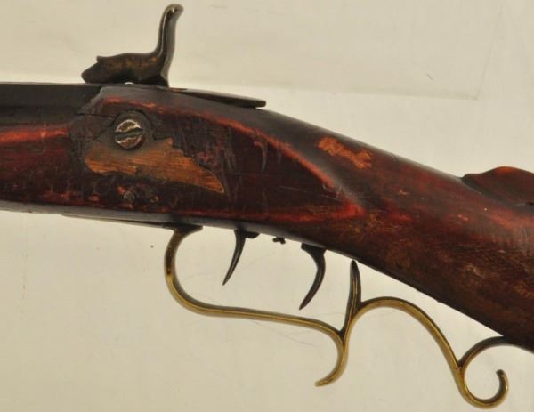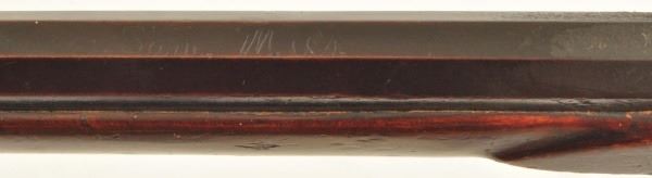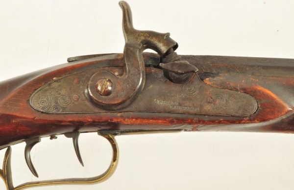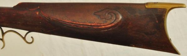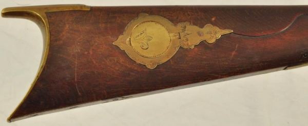 Henry E. Lehman was trained by fellow Lancaster, PA craftsman Melchoir Fordney from 1828-1831. Lehman then worked with George Tryon from 1831-1834 and then finally set out on his own producing contract trade rifles to the Indian Bureau and western traders. His first trade rifles were flintlock full stocks then percussion and ultimately half tocks. By the 1860s Henry Lehman had outsold the competition for the Plains Indian trade. According to records, captured Lehman rifles outnumbered Henrys, Hawkins and Golchers by almost 100 to 1. These short heavy built rifles were built in large caliber flint and percussion for hard use. Their evolution marked the standards for Plains Rifles to come and provided an economical rifle for the common man. No visible Serial number.
