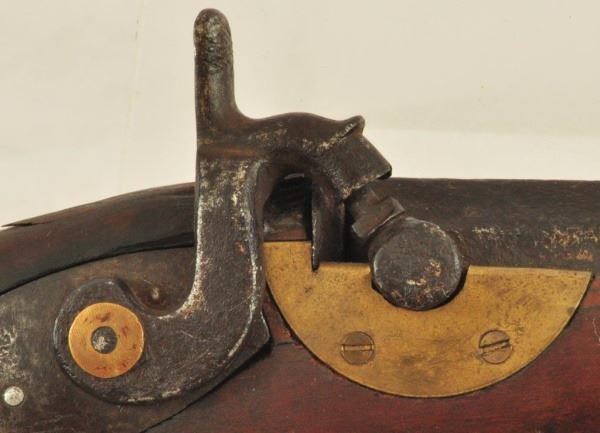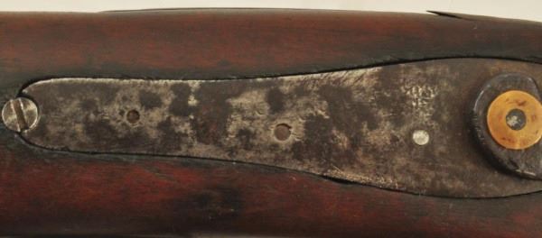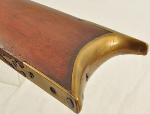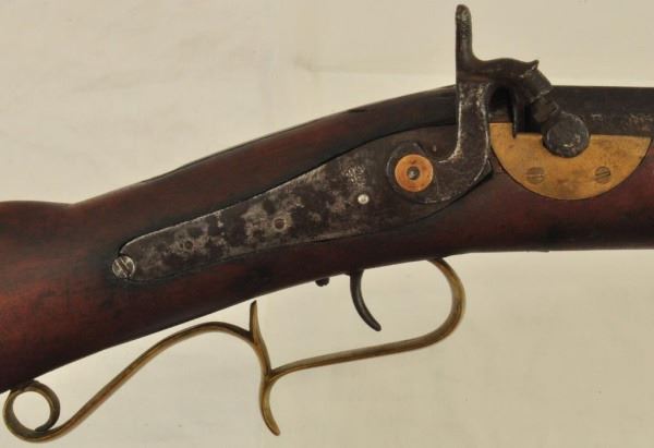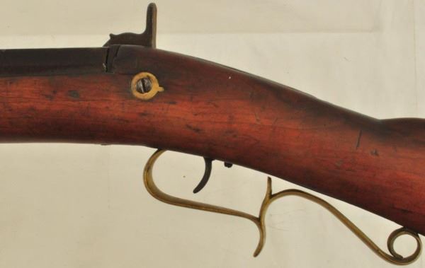 Percussion that looks to be converted by a local blacksmith. Shows it has been used with the short barrel., it was likely carried on horseback. Heavy octagon would allow for a heavy charge powder, providing greater range for buffalo hunting. Has opening in trigger guard for a set trigger plus repairs have been made with parts from other rifles. Just a common rifle use during the 1840 to 1870 era. No visible serial number.