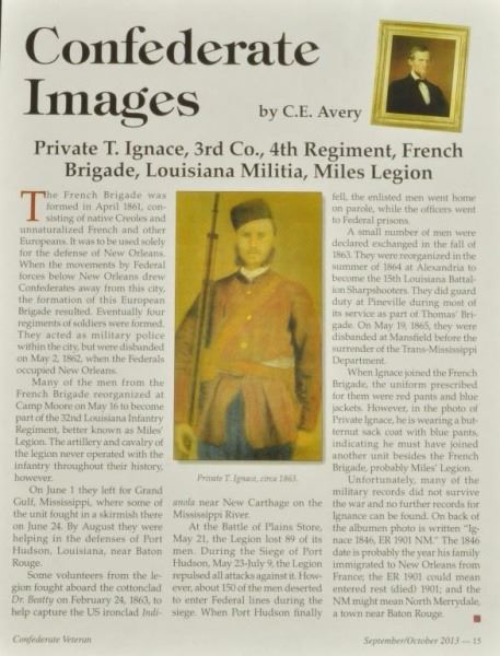 Pictured with Musket and bayonet. Soldier is identified as T. Ignace of Louisiana's 32nd Infantry Regiment. Photo is professionally matted and framed. Same image is printed in Confederate Veterans Magazine. Copy of article included. 25" x 31"
