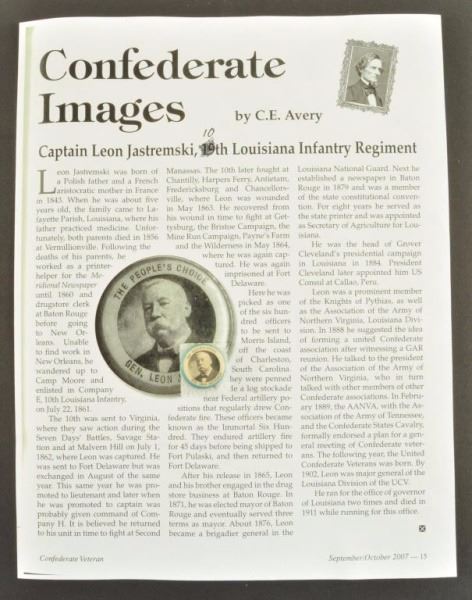 Jastremski served in the 10th Louisiana Infantry during the war. Copy of bio from Confederate Veterans Magazine included.