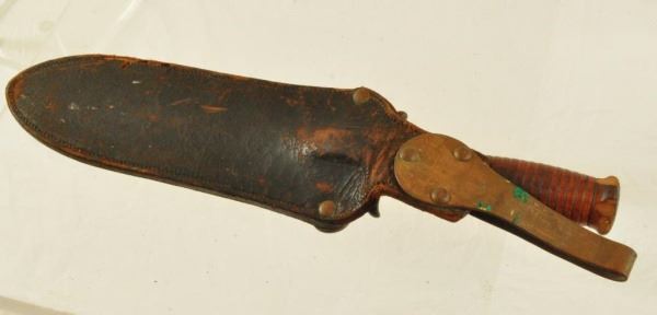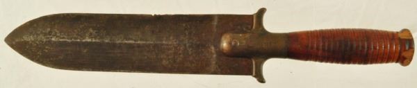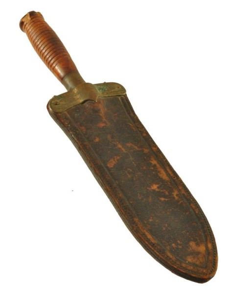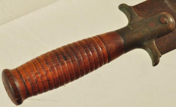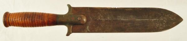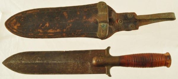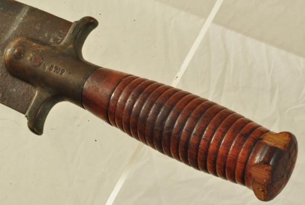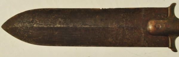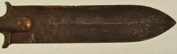 Dated 1892 on brass guard. Polished steel blade with brass guard and extensions to secure blade. Turned wood grip. Hand made Springfield Armory. Dark Leather scabbard with brass throat and belt clip. Handmade Watervlet Arsenal.