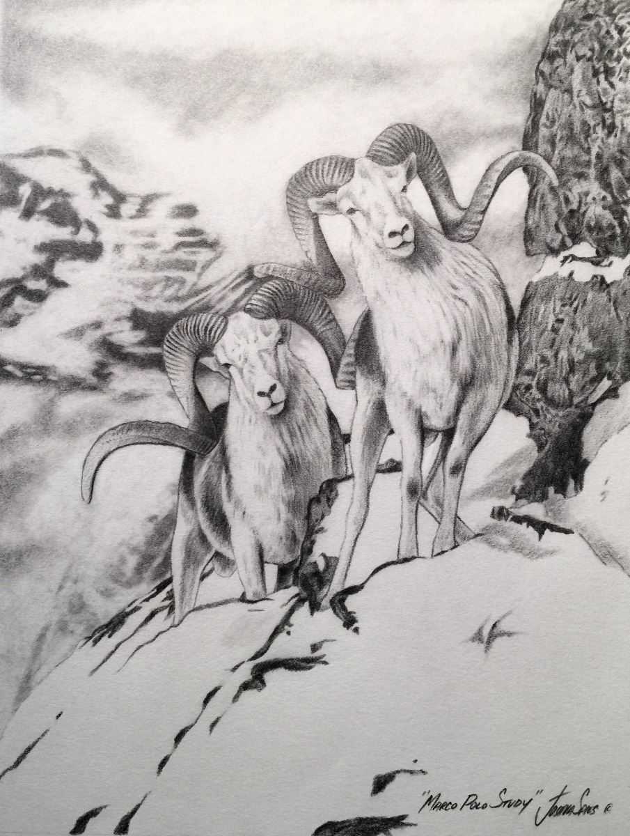 JOSHUA SPIES FINE ART: Marco Polo - original acrylic on canvas painting by wildlife artist Joshua Spies - measures 16x20" unframed. PROCEEDS BENEFIT THE CONKLIN FOUNDATION. REFERENCE CHARITABLE DEDUCTION QUALIFICATION IN THE OFFICIAL AUCTION RULES. Joshua Spies, 605-868-3463, 8605 S Regent Park Dr., Sioux Falls, SD 57108, anne@joshuaspies.com, www.joshuaspies.com. Booth #2734