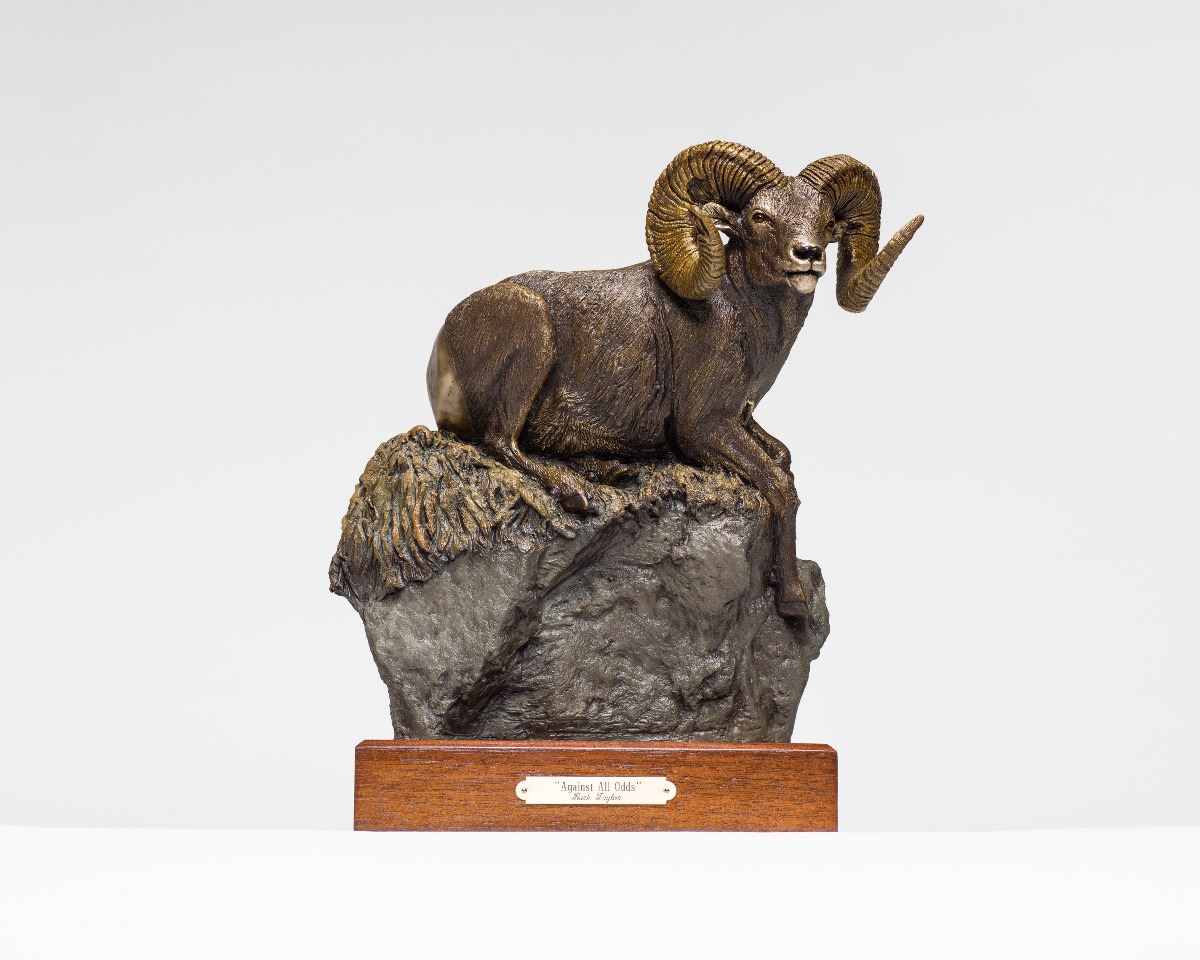 RICK TAYLOR - SCULPTOR: Bronze sculpture, titled "Against All Odds" by long-time donor Rick Taylor, depicts the new world record Boone and Crockett Rocky Mountain Bighorn ram. This remarkable ram, ear tagged #706 as a lamb in 1998, had miraculously survived a bullet wound in the base of his right horn in 2008, but somehow continued to grow and became very reclusive. He met an unfortunate end on January 19, 2010 when he was struck and killed by a vehicle near the ranch where he had spent his last 2 years. The rancher found him and was eventually given a permit to possess the horns. In 2014, the ram was officially scored as the largest ever on record. This bronze is number 1 of an open edition and will undoubtedly be cherished forever by the lucky bidder who wins this auction favorite!!! PROCEEDS BENEFIT THE CONKLIN FOUNDATION. REFERENCE CHARITABLE DEDUCTION QUALIFICATION IN THE OFFICIAL AUCTION RULES. Rick Taylor, 250-353-7735, Box 547, Kaslo, BC V0G-1M0, Canada, rick@ricktaylor.com, www.ricktaylor.com.