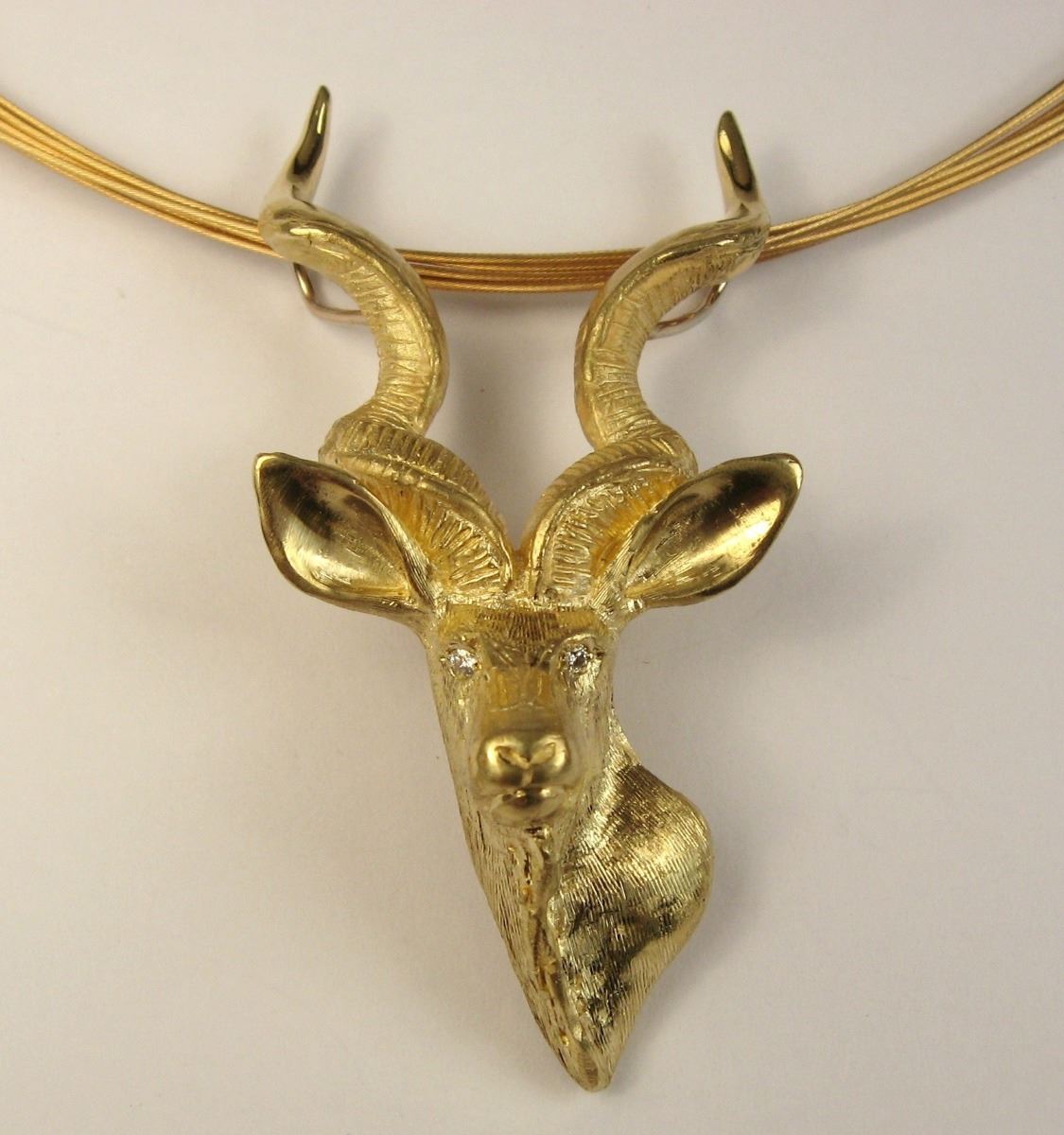 SINGLETON-MOSS CUSTOM GOLDSMITH: This hand-crafted 18K yellow gold kudu pin/pendant with black diamond eyes is from Singleton-Moss' extensive African Wildlife Collection. The entire African and North American lines can be viewed online at singletonmoss.com. Each piece is hand-carved and hand-engraved with very fine detail. Includes an eighteen inch,18K yellow gold cable neck wire. Visit donor booth to customize your own jewelry. DALLAS SAFARI CLUB THANKS SINGLETON-MOSS CUSTOM GOLDSMITH FOR THIS 100% DONATION. Ken Singleton / Linda Moss, 612-346-9314, 401 North 3rd Street, #360, Minneapolis, MN 55401, singletonmoss@aol.com, www.SingletonMoss.com. Booth #862