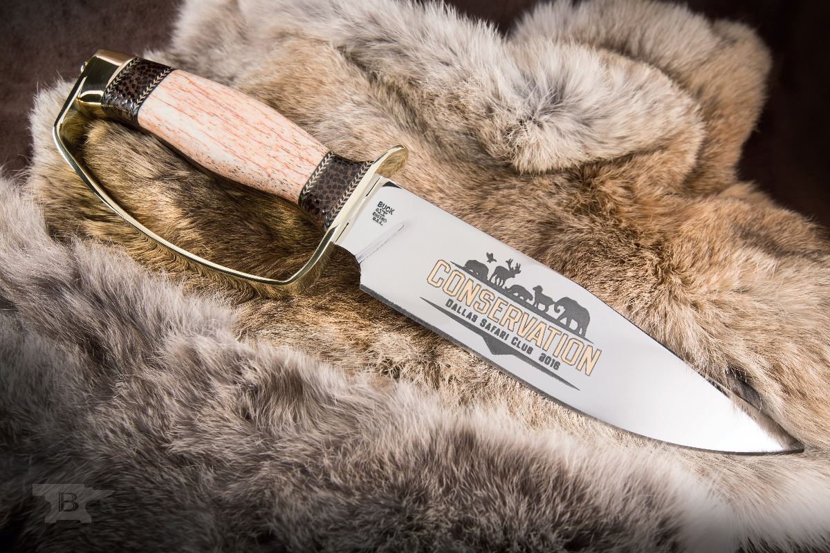 BUCK KNIVES: Model 001 D-Guard Bowie. Blade 420 HC polished with DSC 2016 logo gold plated and acid etched. Giraffe bone handle with palm wood and guitar fret spacer. Brass D-Guard and butt cap. Knife comes with a glass top walnut display case and letter of authenticity. Signed by CJ Buck. Measures 12-3/4" long, 3-1/2" wide. DALLAS SAFARI CLUB THANKS BUCK KNIVES FOR THIS 100% DONATION. Billy Bates, 208-262-0500, 208-659-5288, Fax 208-262-0482, 660 S Lochsa Street, Post Falls, ID 83854, billyb@buckknives.com, www.BuckKnives.com. Booth #3654
