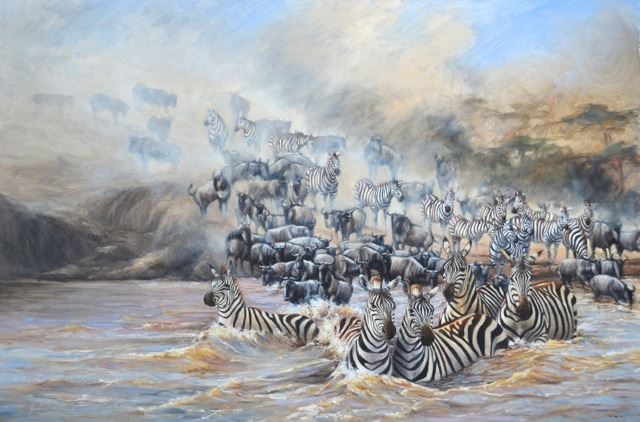 JAMES CORWIN FINE ART: "Mara River Crossing" - Orignal oil on canvas by wildlife artist James Corwin - measures 36"x24". This beautiful artwork comes with an 8" handmade distressed wood frame with gold lining. James Corwin, 406-471-7518, 328 Main Street, Kalispell, MT 59901, jdcorwin@centurytel.net, www.jamescorwin.com. Booth #112