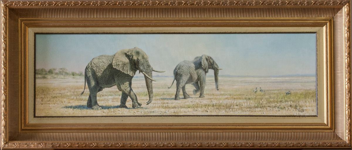 CALL OF AFRICA, INC: "Etosha Salt Pan Elephant" - Beautiful original oil on canvas, by renowned wildlife painter Tony Forrest, complete with custom frame - measures 12"x40". Ross Parker, 954-767-8737, Fax 954-524-7494, 920 NE 13th St, Fort Lauderdale, FL 33304, callofafricawarehouse@yahoo.com, www.CallofAfrica.com. Booth #3137