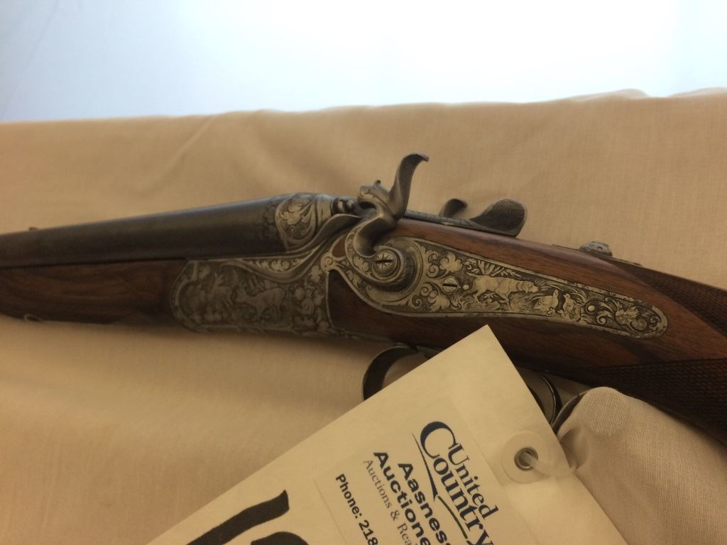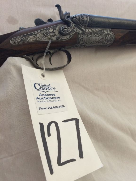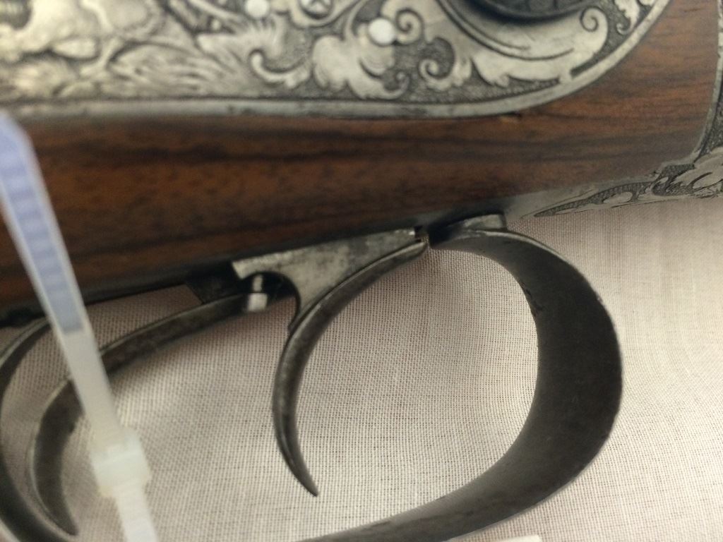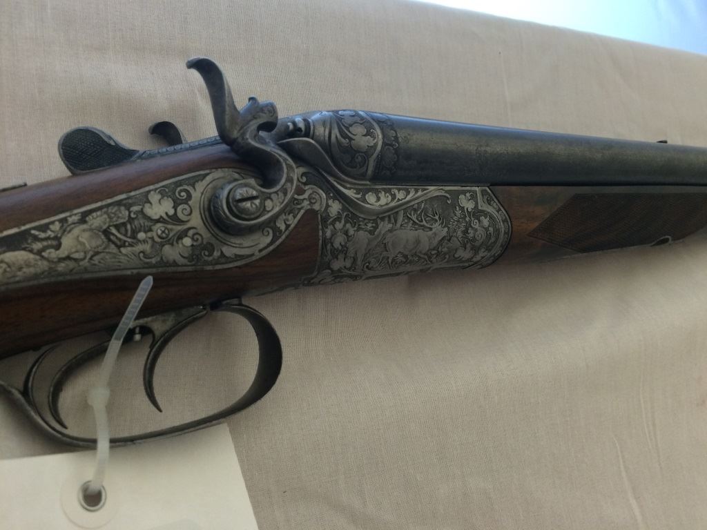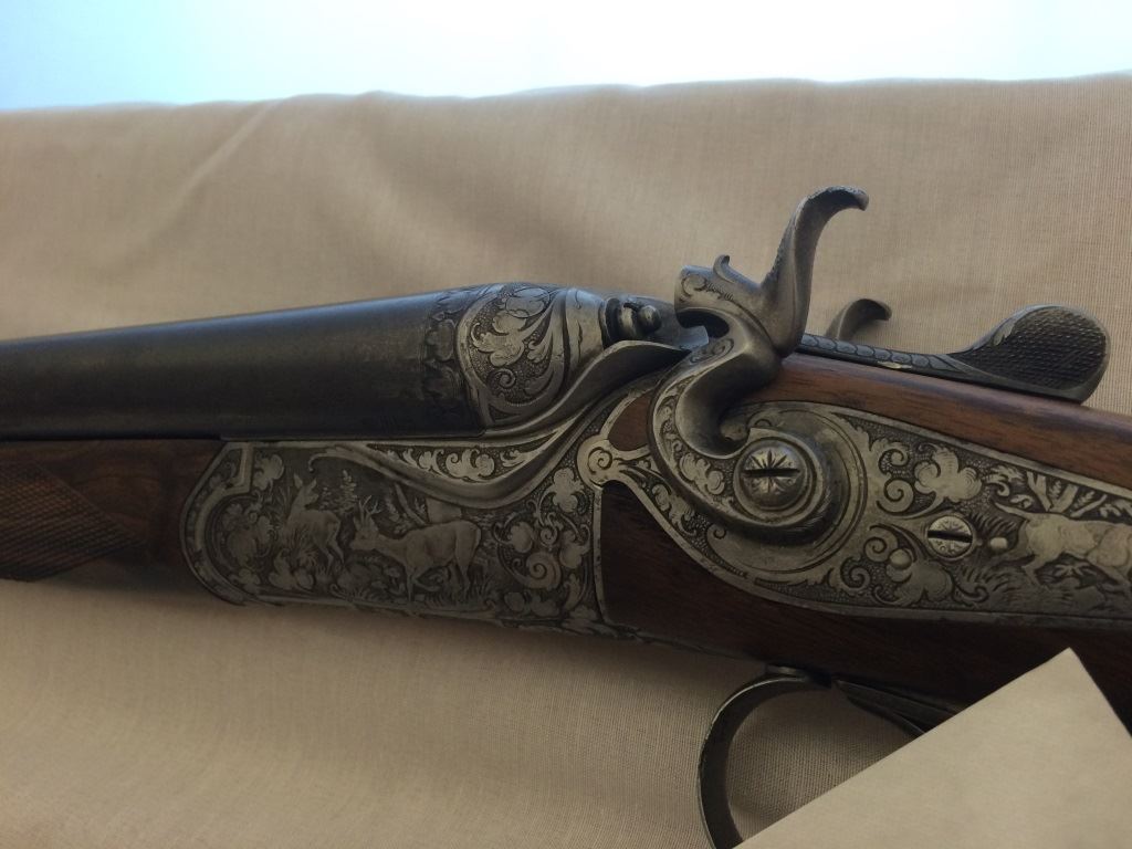 break action open hammer, fancy hi relief hunt scenes,side engraved high grade, cheek piece/pistol grip