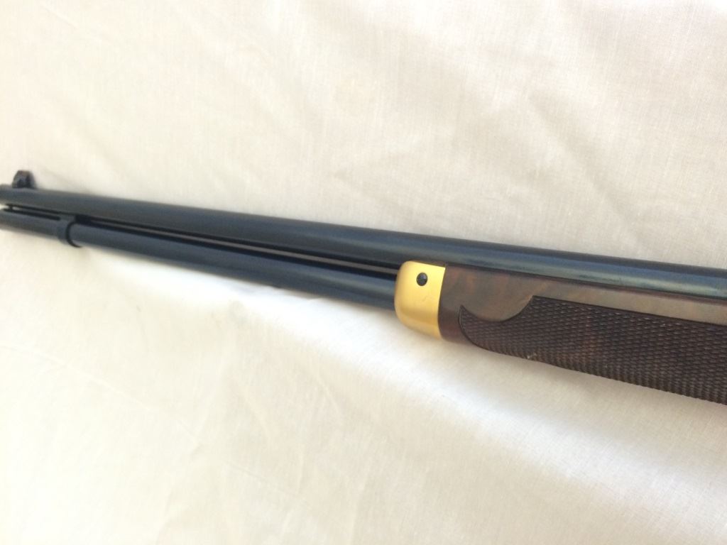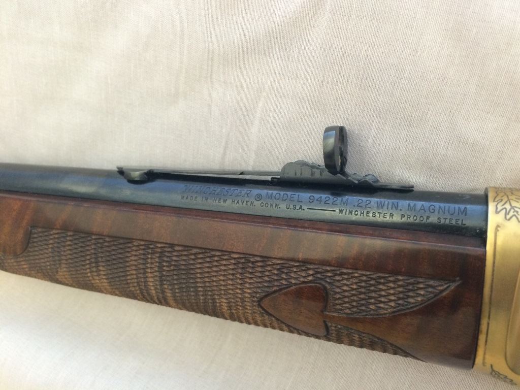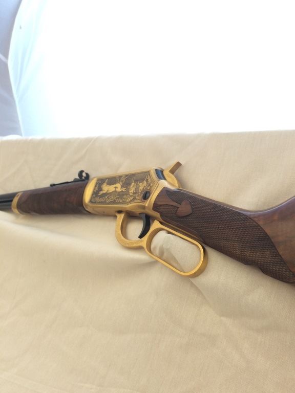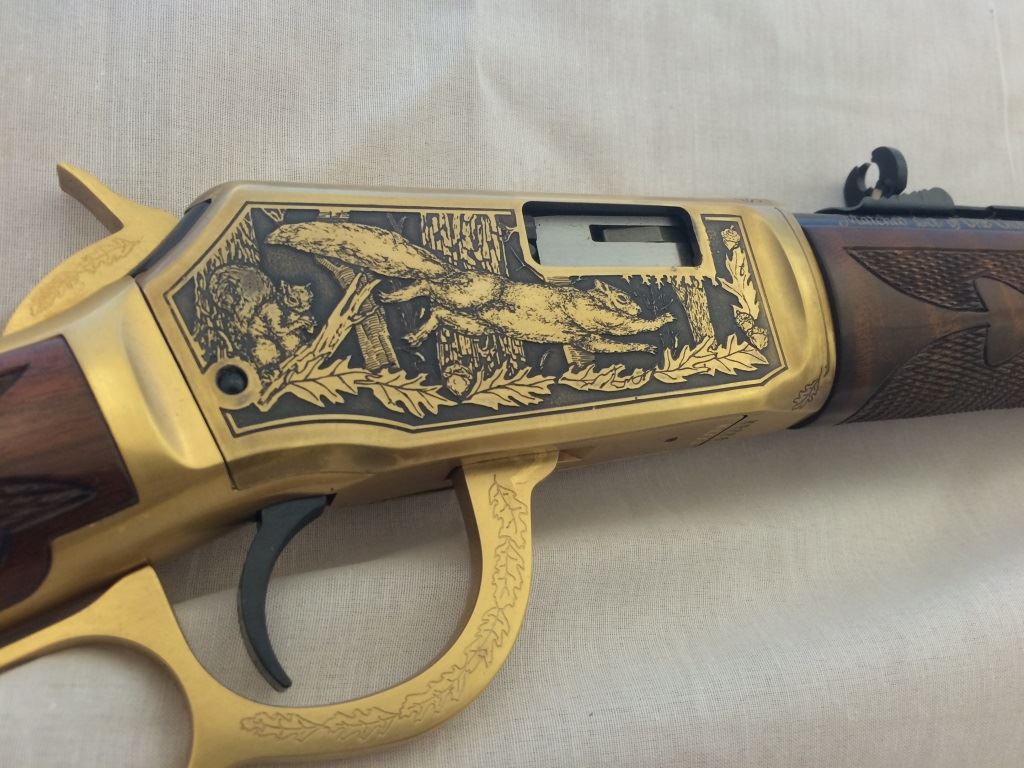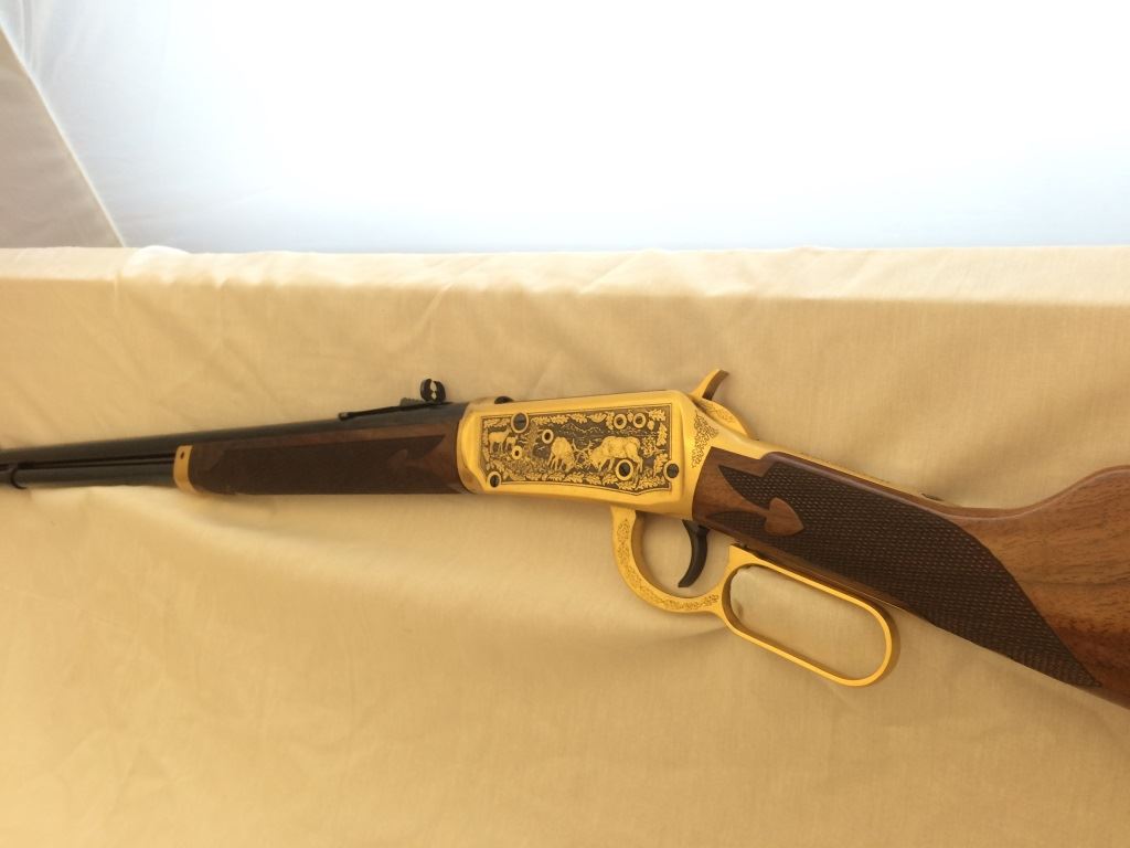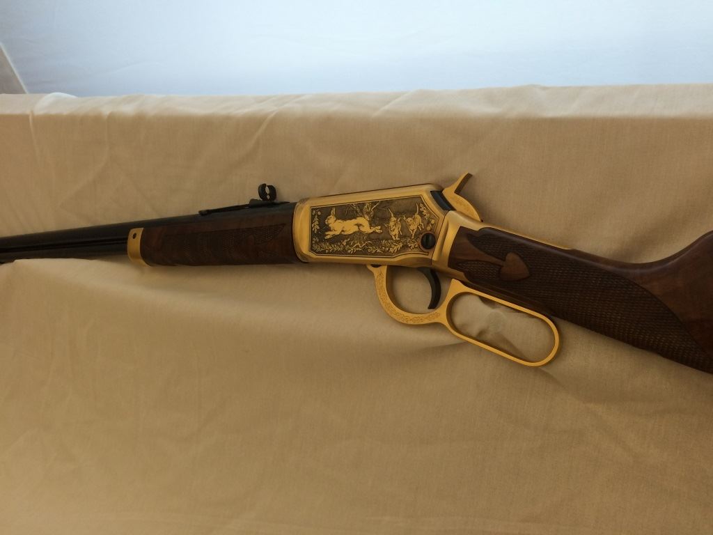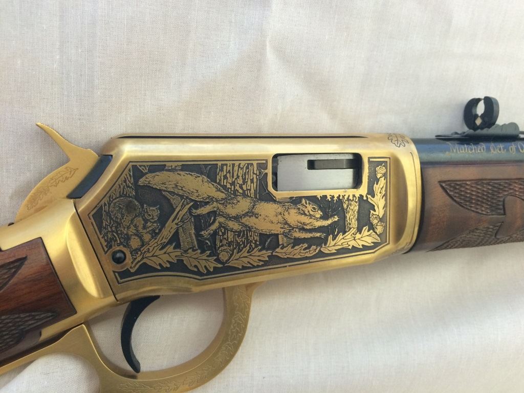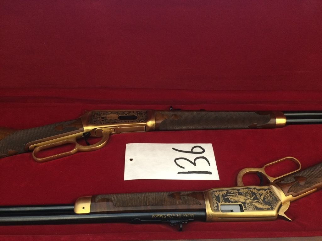 Presentation set 1 of 1000,Winchester Model 9422 22cal Win Mag Lever Action Gold Receiver w/inlay of 2 Dogs chasing a Rabbit and Squirrel, Winchester Lever Action Model 94 30-30cal Lever Action Gold Receiver w/inlay of Elk and Beaver, Deluxe Wood Fine Checkered Forearm and Stock, w/ wooden display case- Beautiful Set!