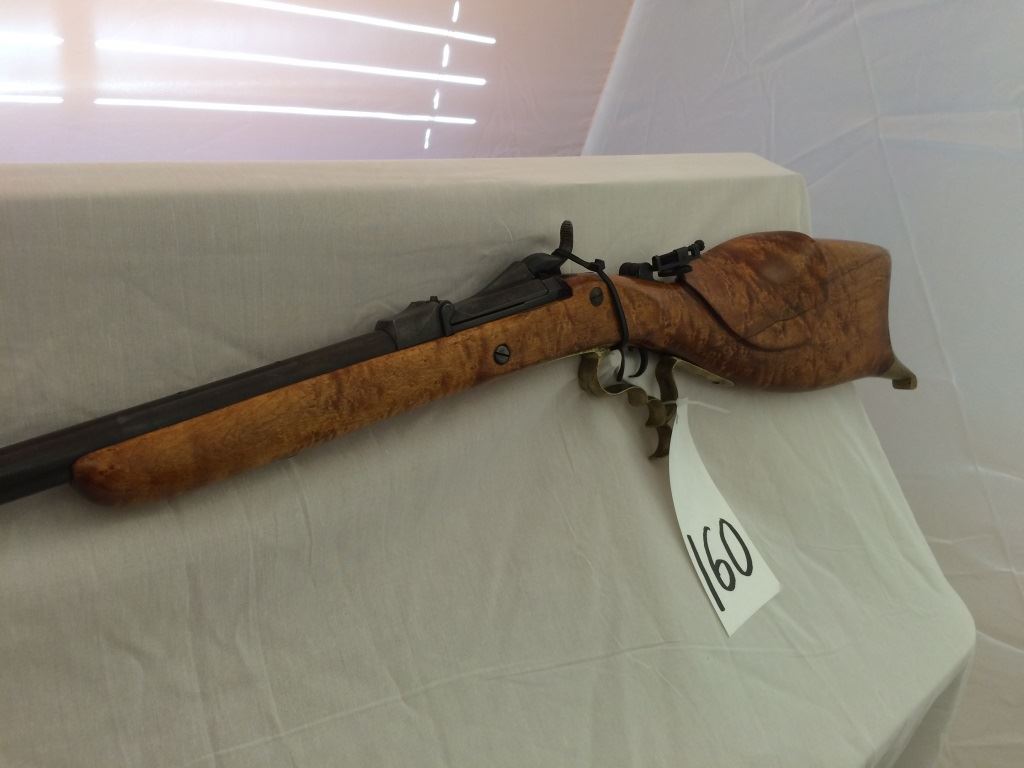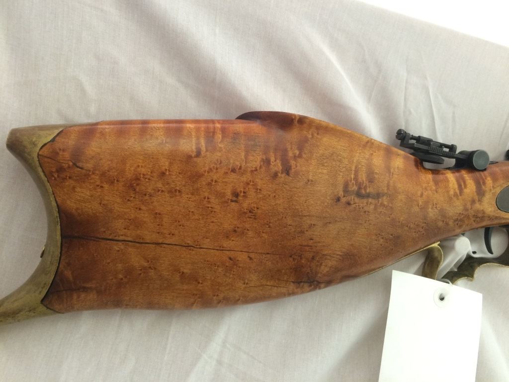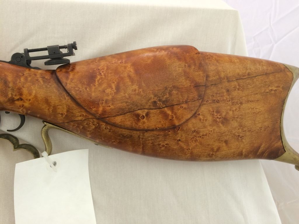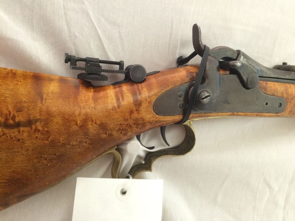 w/adjustable peep site, set trigger, with custom burled cheek piece stock and brass trigger guard and cap, S-1395,(these made from 1865-1893), Neat Rifle!