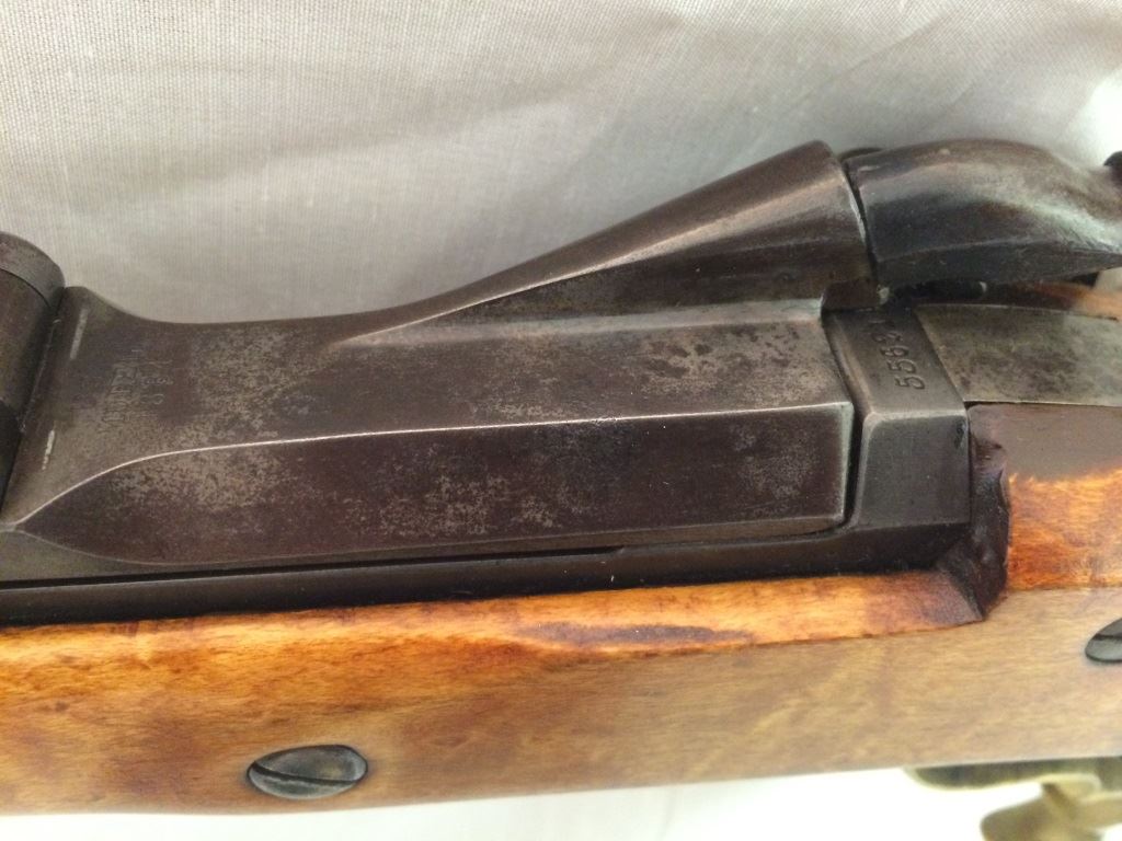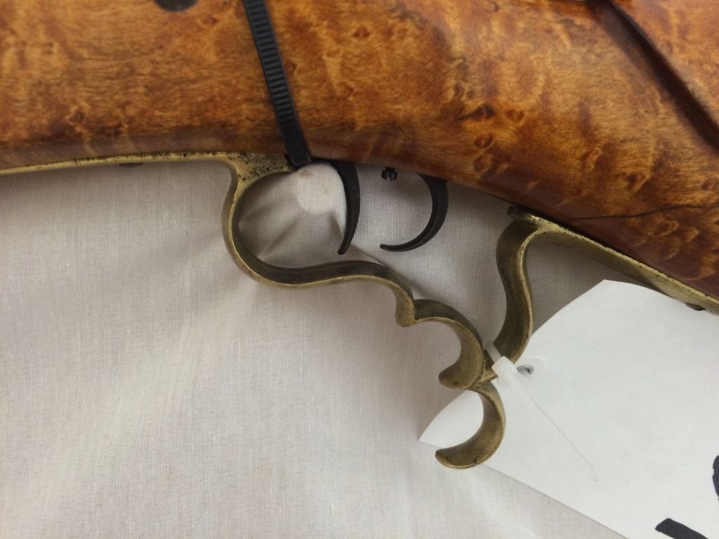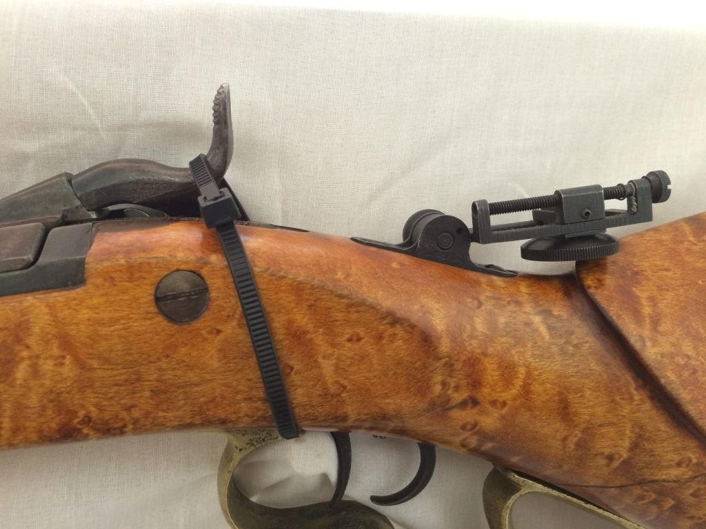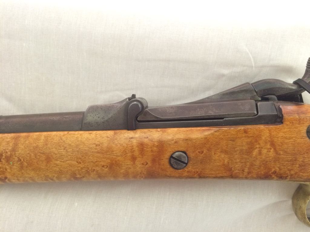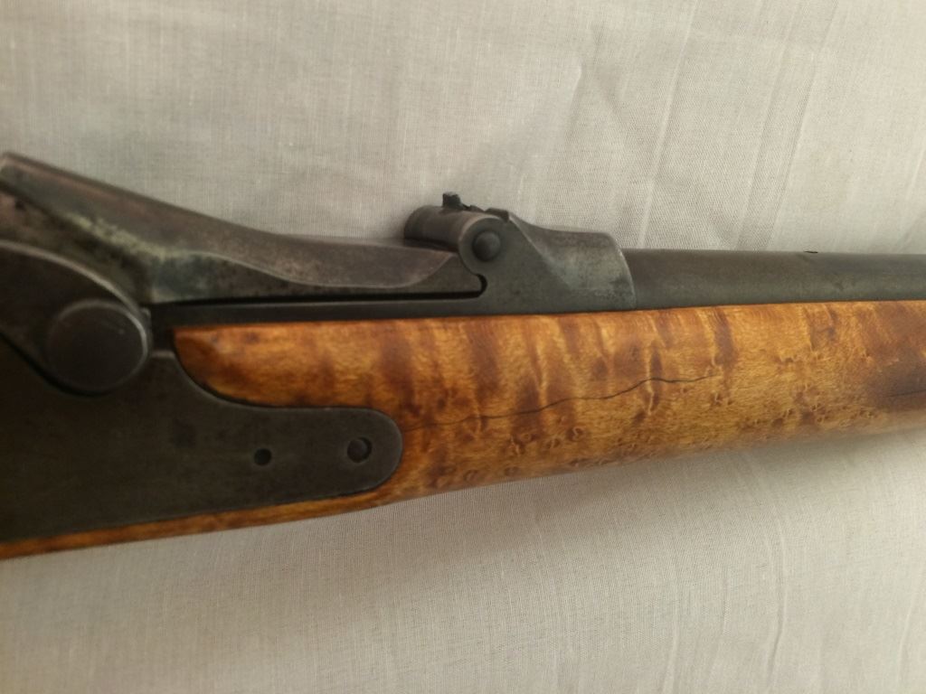 w/adjustable peep site, set trigger, with custom burled cheek piece stock and brass trigger guard and cap, S-1395,(these made from 1865-1893), Neat Rifle!
