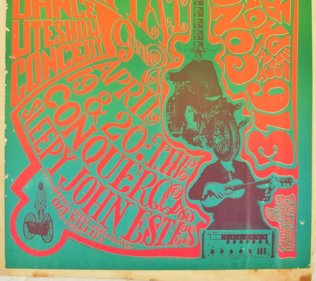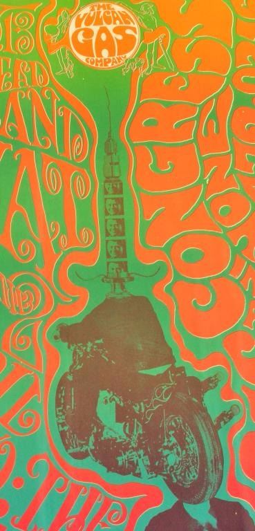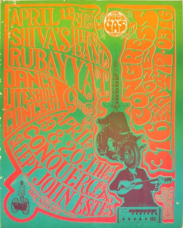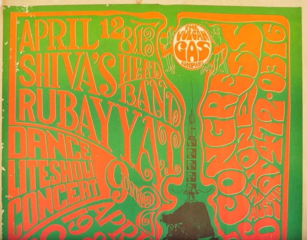Vulcan Gas Company, Austin, TX. April 12, 1968. Shiva's Head Band Artist: Gilbert Shelton. Linen backed, 21-1/2" x 27"
