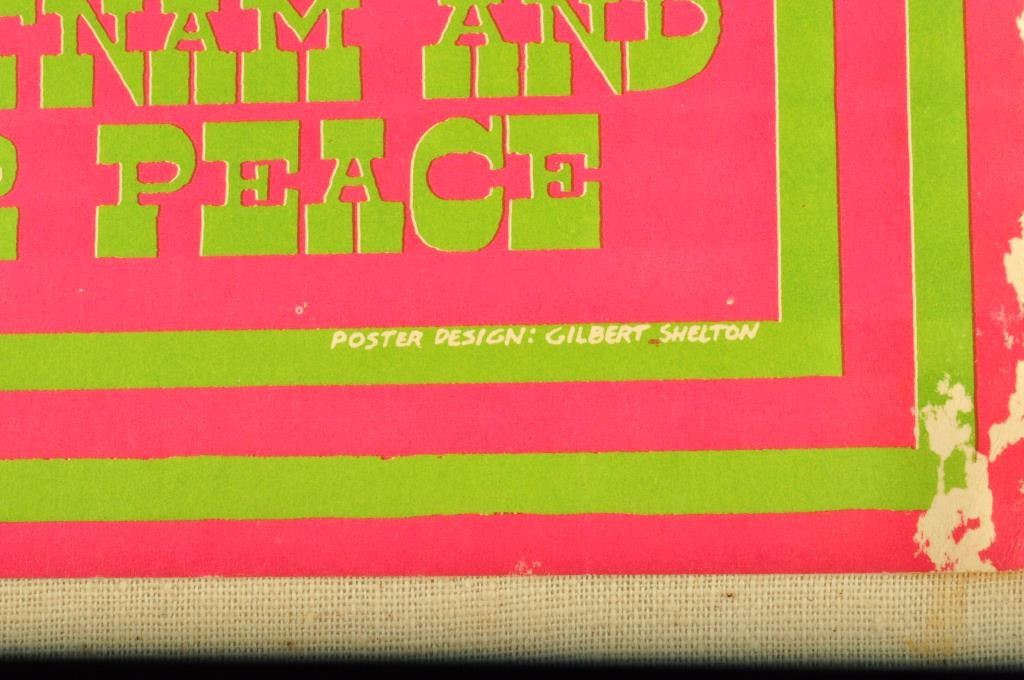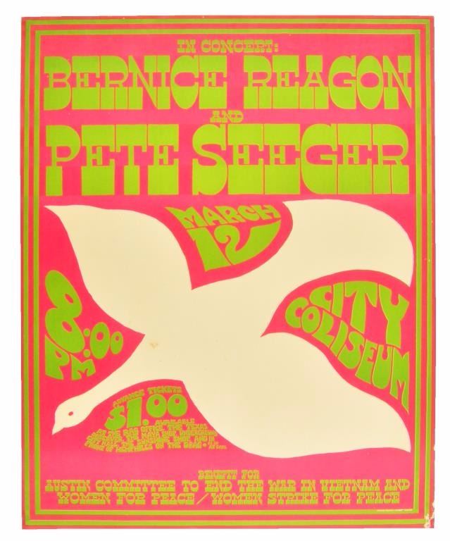 Bernice Reagan & Pete Seeger Concert Poster City Coliseum, Austin, TX. March 12, 1968. Early Vulcan Gas Production. Artist: Gilbert Shelton. Linen backed. 22" x 27-1/2".